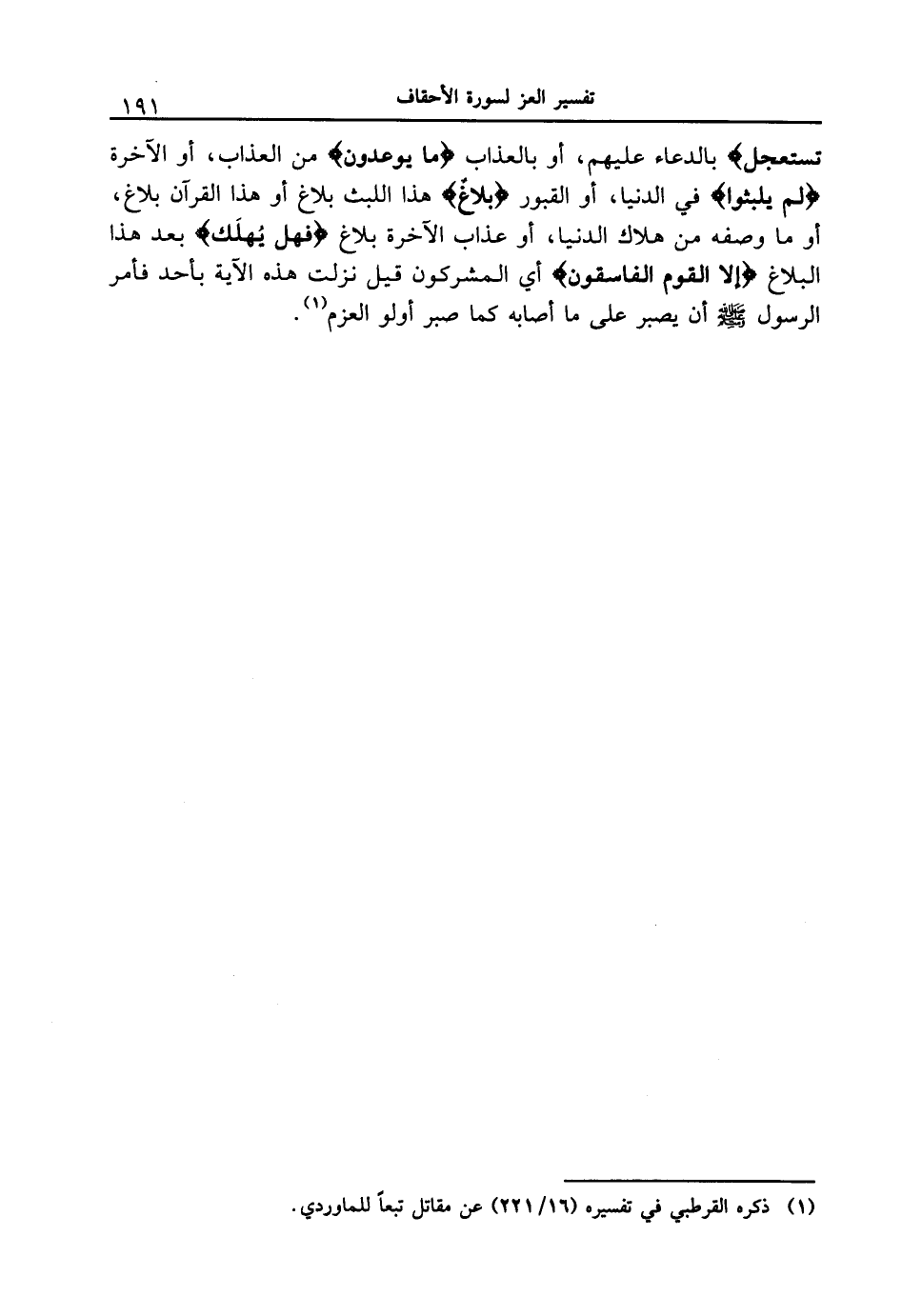 تَسْتَعْجِل} بالدعاء عليهم، أو بالعذاب {مَا يُوعَدُونَ} من العذاب، أو الآخرة {لَمْ يَلْبَثُواْ} في الدنيا، أو القبور {بلاغٌ} هذا اللبث بلاغ أو هذا القرآن بلاغ، أو ما وصفه من هلاك الدنيا، أو عذاب الآخرة بلاغ {فَهَلْ يُهلَكَ} بعد هذا البلاغ {إِلا الْقَوْمُ الْفَاسِقُونَ} أي المشركون قيل نزلت هذه الآية بأحد فأمر الرسول [صلى الله عليه وسلم] أن يصبر على ما أصابه كما صبر أولو العزم.