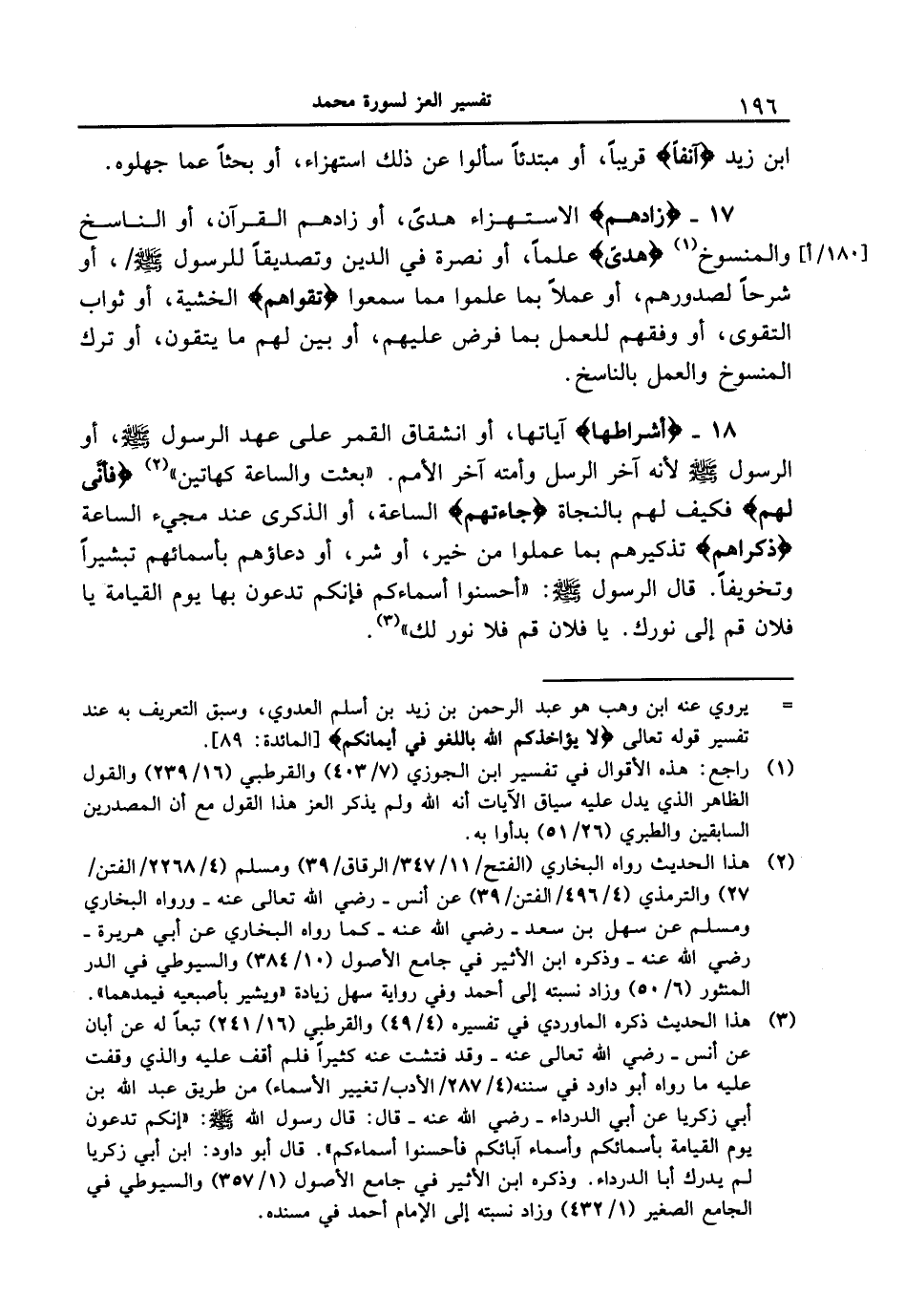 17 - {زَادَهُمْ} الاستهزاء هدى، أو زادهم القرآن، أو الناسخ والمنسوخ {هُدىً} علماً، أو نصرة في الدين وتصديقاً للرسول [صلى الله عليه وسلم] [180 / أ] /، أو شرحاً لصدورهم، أو عملاً بما علموا مما سمعوا {تَقْوَاهُمْ} الخشية، أو ثواب التقوى، أو وفقهم للعمل بما فرض عليهم، أو بين لهم ما يتقون، أو ترك المنسوخ والعمل بالناسخ.