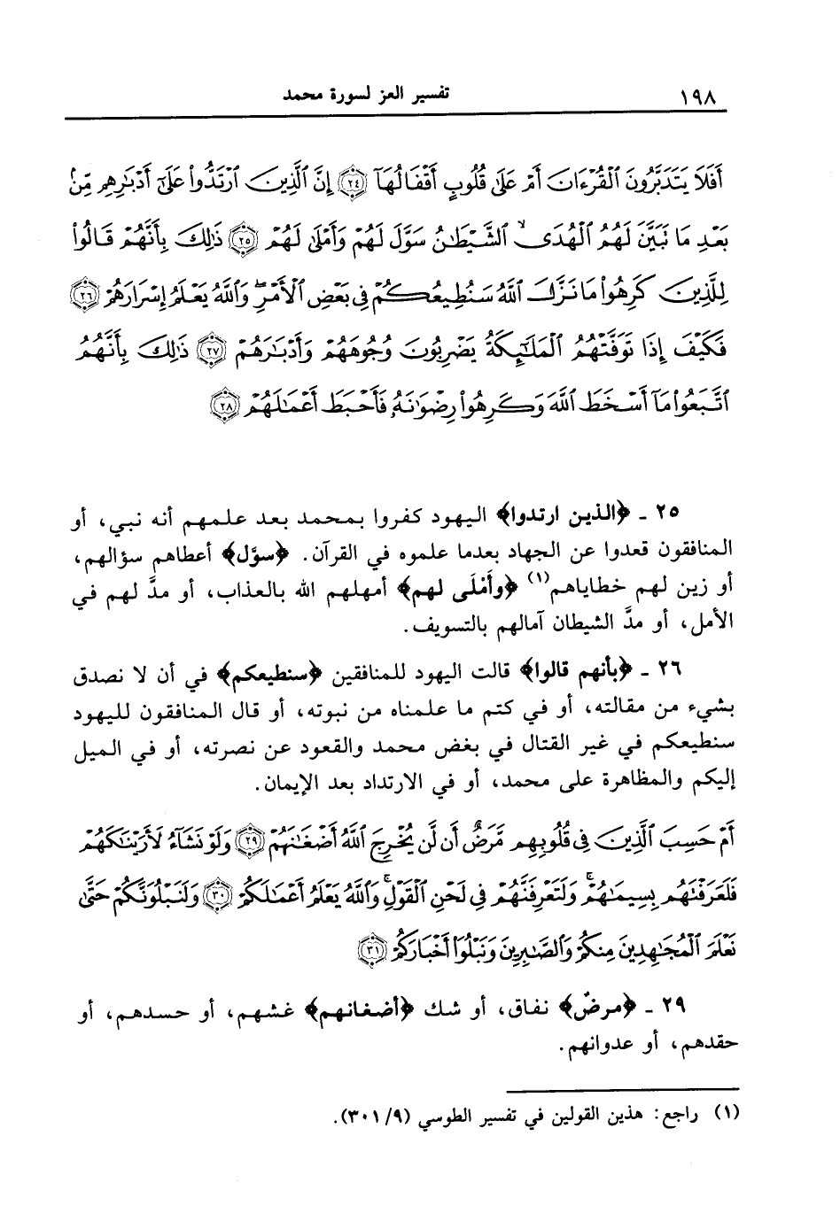25 - {الَّذِينَ ارْتَدُّواْ} اليهود كفروا بمحمد بعد علمهم أنه نبي، أو المنافقون قعدوا عن الجهاد بعدما علموه في القرآن. {سَوَّلَ} أعطاهم سؤالهم، أو زين لهم خطاياهم {وَأَمْلَى لَهُمْ} أمهلهم الله بالعذاب، أو مدَّ لهم في الأمل، أو مدَّ الشيطان آمالهم بالتسويف.