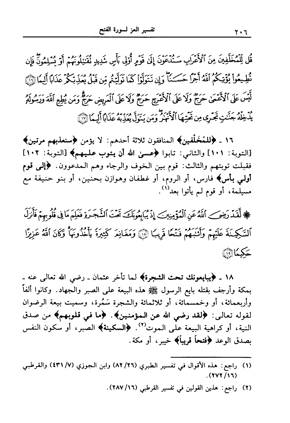 {قل للمخلفين من الأعراب ستدعون إلى قوم أولي بأس شديدٍ تقاتلونهم أو يسلمون فإن تطيعوا يؤتكم الله أجراً حسناً وإن تتولوا كما توليتم من قبل يعذبكم عذاباً أليماً (16) ليس على الأعمى حرجٌ ولا على الأعرج حرجٌ ولا على المريض حرجٌ ومن يطع الله ورسوله يدخله جناتٍ تجري من تحتها الأنهار ومن يتول يعذبه عذاباً أليماً (17) }