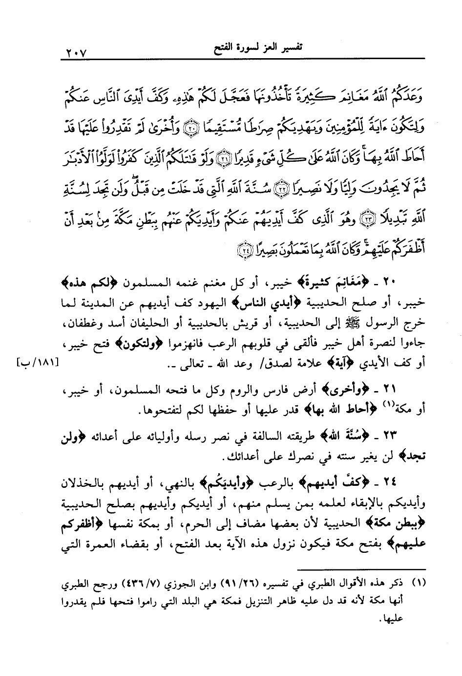 24 - {كَفَّ أَيْدِيَهُمْ} بالرعب {وَأَيْدِيَكُمْ} بالنهي، أو أيديهم بالخذلان وأيديكم بالإبقاء لعلمه بمن يسلم منهم، أو أيديكم وأيديهم بصلح الحديبية {بِبَطْنِ مَكَّةَ} الحديبية لأن بعضها مضاف إلى الحرم، أو بمكة نفسها {أَظْفَرَكُمْ عَلَيْهِمْ} بفتح مكة فيكون نزول هذه الآية بعد الفتح، أو بقضاء العمرة التي