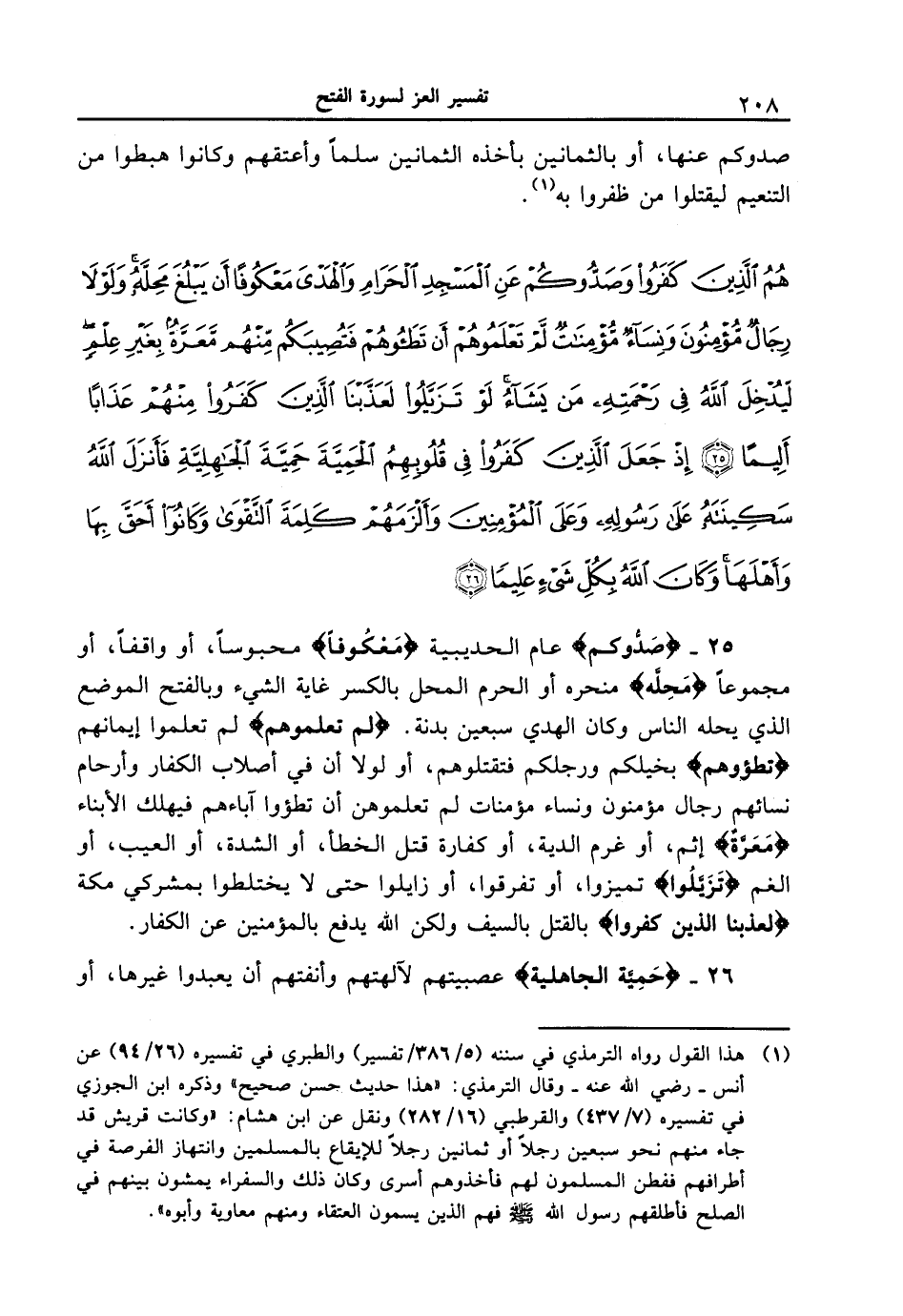 25 - {صدوكم} عام الحديبية {مَعْكُوفاً} محبوساً، أو واقفاً، أو مجموعاً {مَحِلَّهُ} منحره أو الحرم المحل بالكسر غاية الشيء وبالفتح الموضع الذي يحله الناس وكان الهدى سبعين بدنة. {لَّمْ تَعْلَمُوهُمْ} لم تعلموا إيمانهم {تطؤوهم} بخيلكم ورجلكم فتقتلوهم، أو لولا أن في أصلاب الكفار وأرحام نسائهم رجال مؤمنون ونساء مؤمنات لم تعلموهن أن تطؤوا آبائهم فيهلك الأبناء {مَّعَرَّةٌ} إثم، أو غرم الدية، أو كفارة قتل الخطأ، أو الشدة، أو العيب، أو الغم {تزيلوا} تميزوا، أو تفرقوا، أو زايلوا حتى لا يختلطوا بمشركي مكة {لَعَذَّبْنَا الَّذِينَ كَفَرُواْ} بالقتل بالسيف ولكن الله يدفع بالمؤمنين عن الكفار.