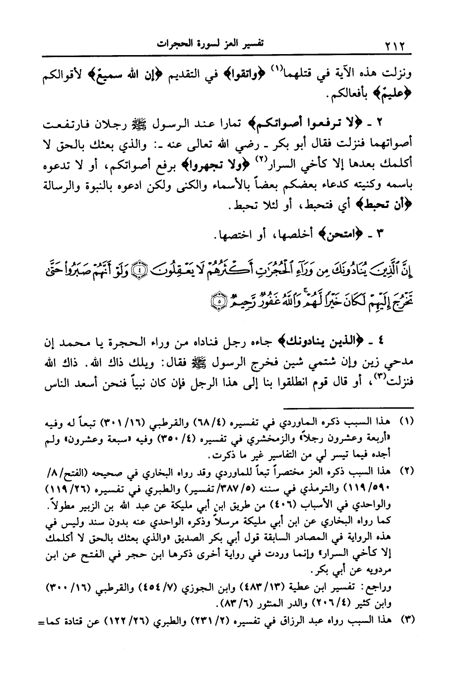 4 - {الَّذِينَ يُنَادُونَكَ} جاءه رجل فناداه من وراء الحجرة يا محمد إن مدحي زين وإن شتمي شين فخرج الرسول [صلى الله عليه وسلم] فقال: ويلك ذاك الله. ذاك الله فنزلت، أو قال قوم انطلقوا بنا إلى هذا الرجل فإن كان نبياً فنحن أسعد الناس