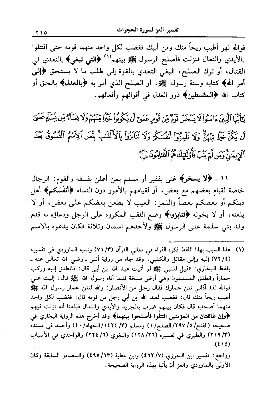 فوالله لهو أطيب ريحاً منك ومن أبيك فغضب لكل واحد منهما قومه حتى اقتتلوا بالأيدي والنعال فنزلت فأصلح الرسول [صلى الله عليه وسلم] بينهم {الَّتِى تَبْغِى} بالتعدي في القتال، أو ترك الصلح، البغي التعدي بالقوة إلى طلب ما لا يستحق {إِلَى أَمْرِ اللَّهِ} كتابه وسنة رسوله [صلى الله عليه وسلم] ، أو الصلح الذي أمر به {بِالْعَدْلِ} بالحق أو كتاب الله {الْمُقْسِطِينَ} ذوو العدل في أقوالهم وأفعالهم.