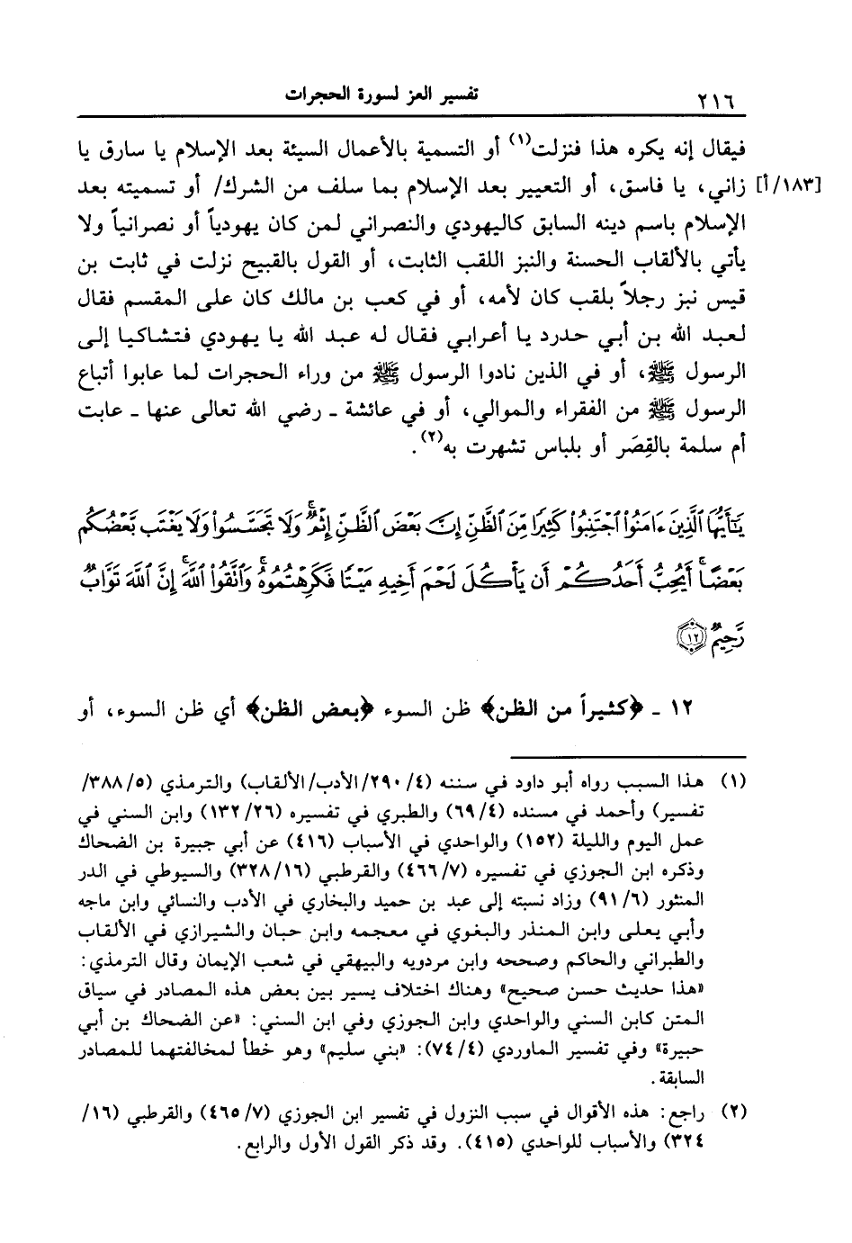 12 - {كَثِيراً مِّنَ الظَّنِّ} ظن السوء {بَعْضَ الظَّنِّ} أي ظن السوء، أو