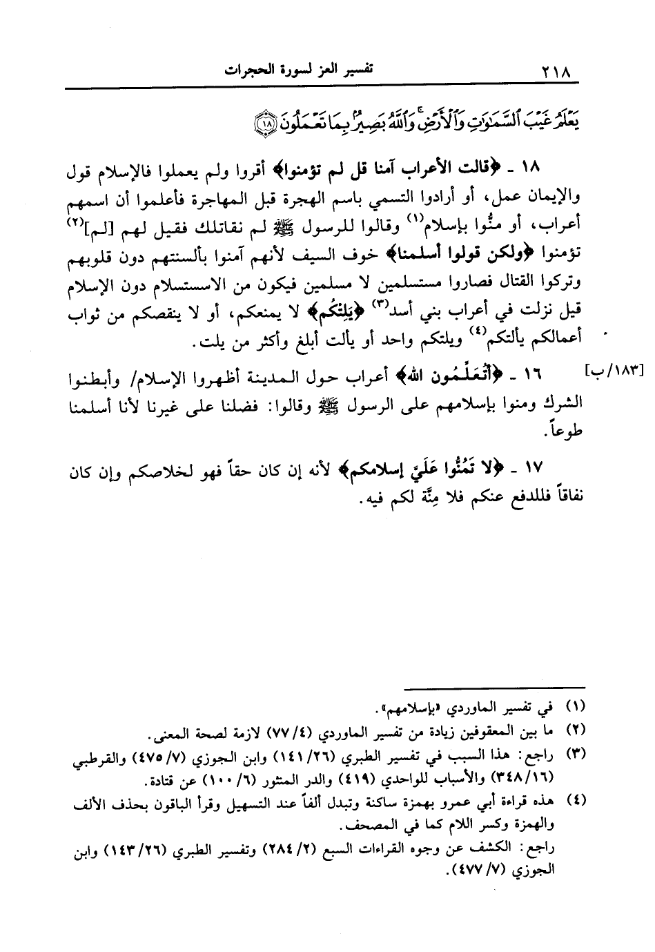 18 - {قالت الأعراب آمنا قُل لَّمْ تُؤْمِنُواْ} أقروا ولم يعملوا فالإسلام قول والإيمان عمل، أو أرادوا التسمي باسم الهجرة قبل المهاجرة فأعلموا أن اسمهم أعراب، أو منُّوا بإسلام وقالوا للرسول [صلى الله عليه وسلم] لم نقاتلك فقيل لهم [لم] تؤمنوا {وَلَكِن قُولُواْ أَسْلَمْنَا} خوف السيف لأنهم آمنوا بألسنتهم دون قلوبهم وتركوا القتال فصاروا مستسلمين لا مسلمين فيكون من الاستسلام دون الإسلام قيل نزلت في أعراب بني أسد {يَلِتْكُم} لا يمنعكم، أو لا ينقصكم من ثواب أعمالكم يألتكم ويلتكم واحد أو يألت أبلغ وأكثر من يلت.