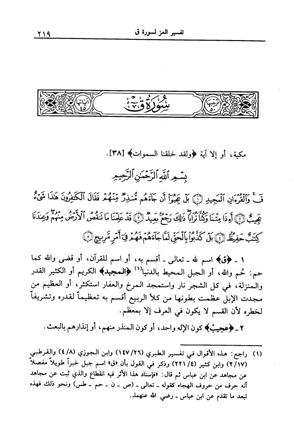 1 - {ق} اسم لله - تعالى - أقسم به، أو اسم للقرآن، أو قضى والله كما حم: حُم والله، أو الجبل المحيط بالدنيا {الْمَجِيدِ} الكريم أو الكثير القدر والمنزلة، في كل الشجر نار واستمجد المرخ والعفار استكثر، أو العظيم من مجدت الإبل عظمت بطونها من كلأ الربيع أقسم به تعظيماً لقدره وتشريفاً لخطره لأن القسم لا يكون في العرف إلا بمعظم.