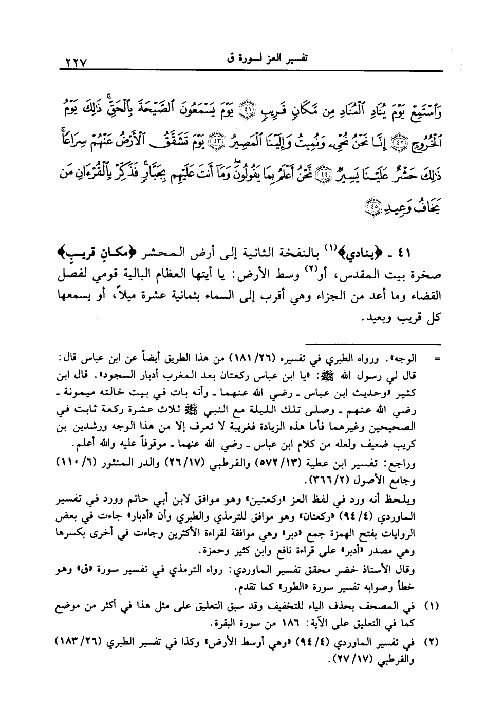 41 - {ينادي} بالنفخة الثانية إلى أرض المحشر {مَّكَانٍ قَرِيبٍ} صخرة بيت المقدس، أو وسط الأرض: يا أيتها العظام البالية قومي لفصل القضاء وما أعد من الجزاء وهي أقرب إلى السماء بثمانية عشرة ميلاً، أو يسمعها كل قريب وبعيد.