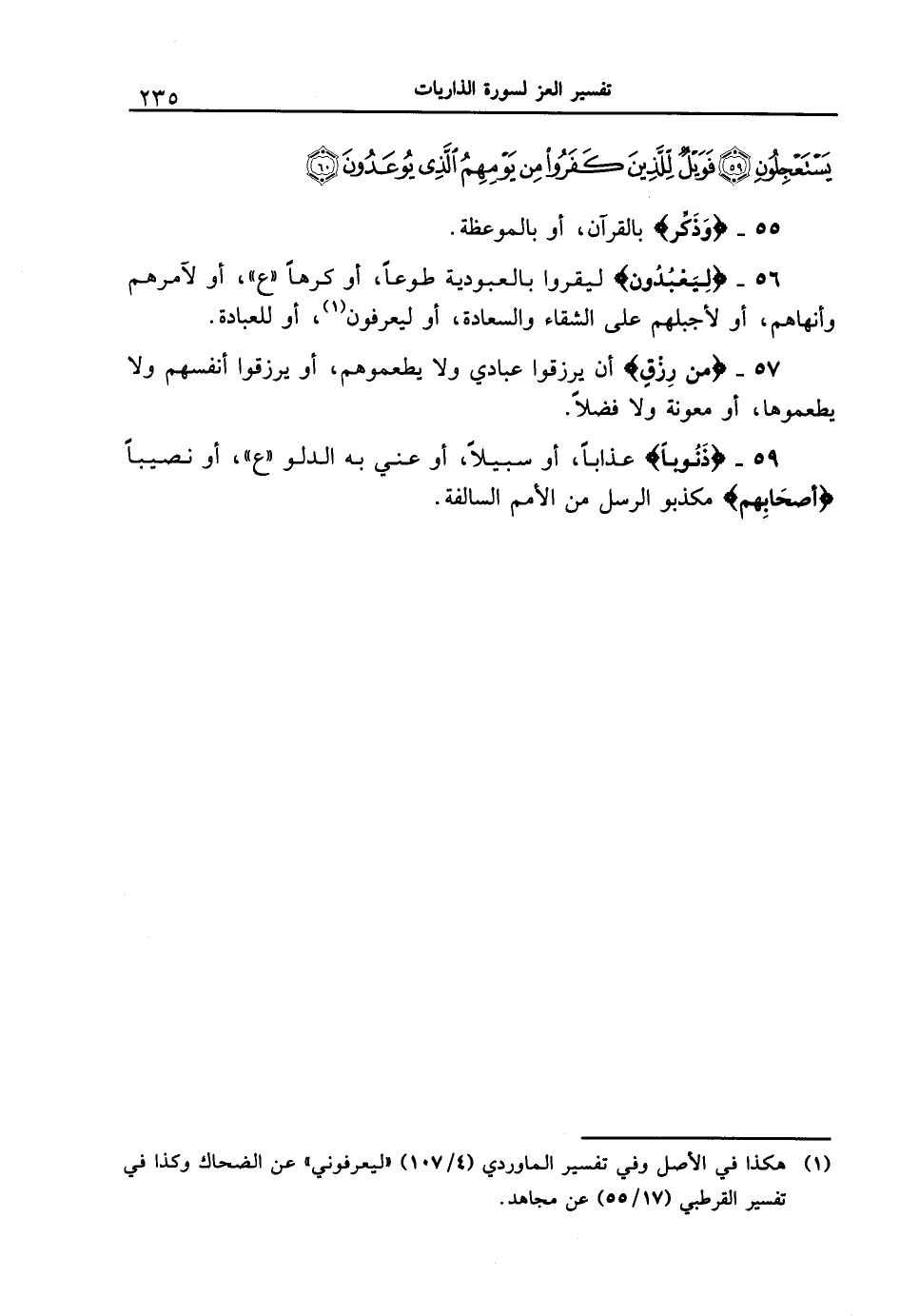 56 - {لِيَعْبُدُون} ليقروا بالعبودية طوعاً، أو كرهاً " ع "، أو لآمرهم وأنهاهم، أو لأجبلهم على الشقاء والسعادة، أو ليعرفون، أو للعبادة.
