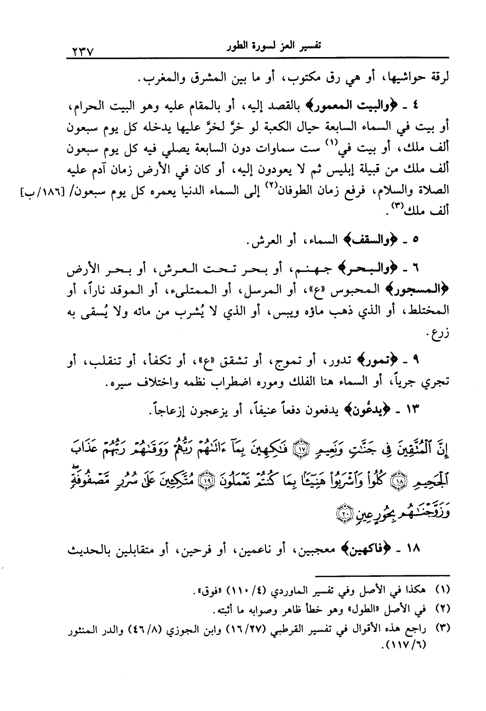 4 - {وَالْبَيْتِ الْمَعْمُورِ} بالقصد إليه، أو بالمقام عليه وهو البيت الحرام، أو بيت في السماء السابعة حيال الكعبة لو خرَّ لخرَّ عليها يدخلها كل يوم سبعون ألف ملك، أو بيت في ست سماوات دون السابعة يصلي فيه كل يوم سبعون ألف ملك من قبيلة إبليس ثم لا يعودون إليه، أو كان في الأرض زمان آدم عليه الصلاة والسلام، فرفع زمان الطوفان إلى السماء الدنيا يعمره كل يوم سبعون [183 / ب] / ألف ملك.