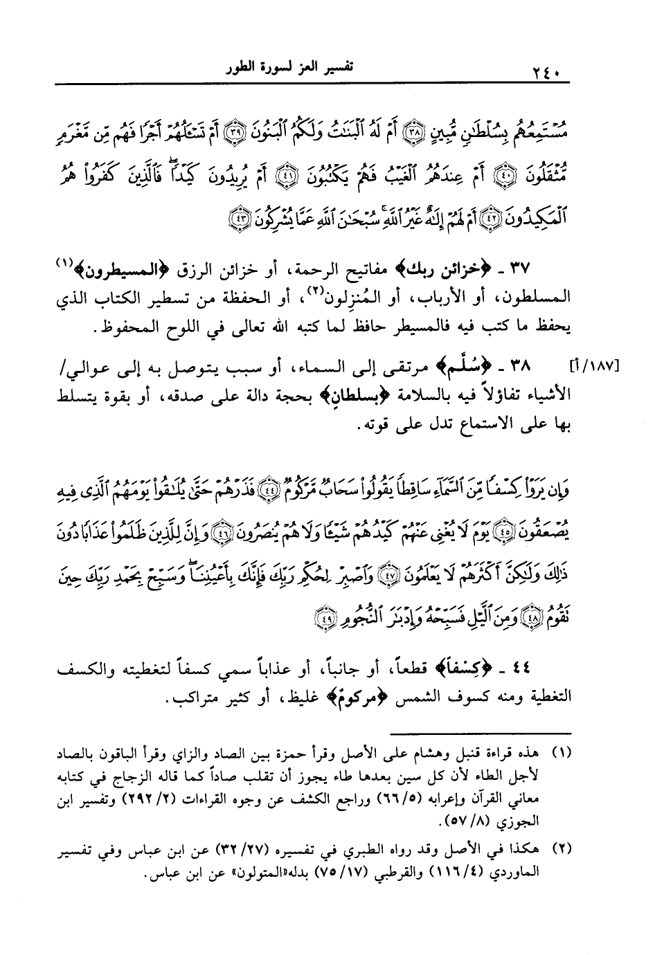 38 - {سُلَّم} مرتقى إلى السماء، أو سبب يتوصل به إلى عوالي [187 / أ] / الأشياء تفاؤلاً فيه بالسلامة {بسلطانٍ} بحجة دالة على صدقه، أو بقوة يتسلط بها على الاستماع تدل على قوته.