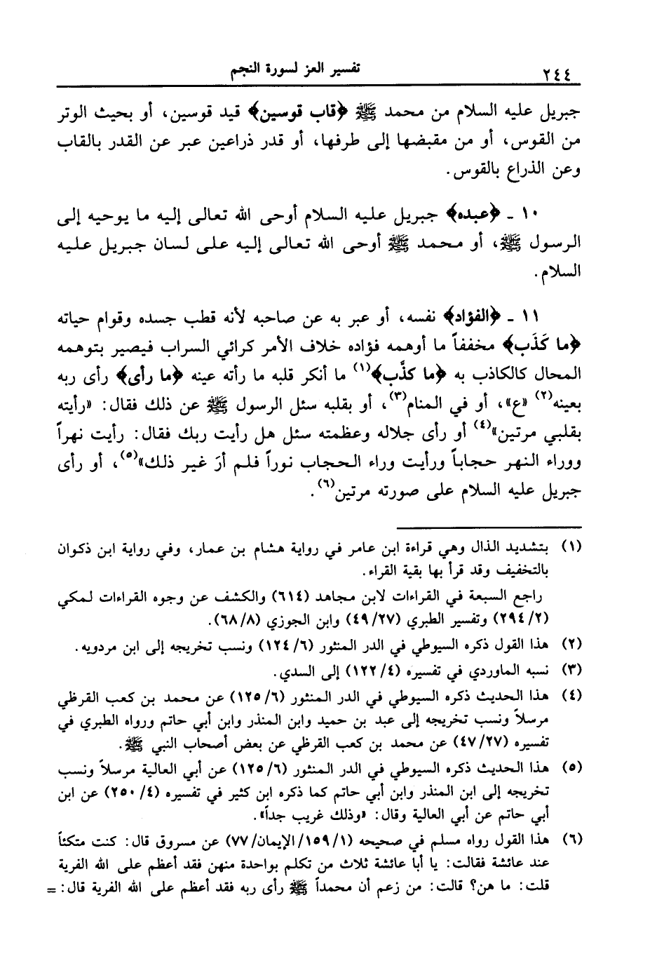 11 - {الْفُؤَادُ} نفسه، أو عبّر به عن صاحبه لأنه قطب جسده وقوام حياته {مَا كَذَبَ} مخففاً ما أوهمه فؤاده خلاف الأمر كرائي السراب فيصير بتوهمه المحال كالكاذب به {ما كذَّب} ما أنكر قلبه ما رأته عينه {مَا رَأَى} رأى ربه بعينه " ع "، أو في المنام، أو بقلبه سئل الرسول [صلى الله عليه وسلم] عن ذلك فقال: " رأيته بقلبي مرتين " أو رأى جلاله وعظمته سئل هل رأيت ربك فقال: رأيت نهراً ووراء النهر حجاباً ورأيت وراء الحجاب نوراً فلم أرَ غير ذلك "، أو رأى جبريل عليه السلام على صورته مرتين.