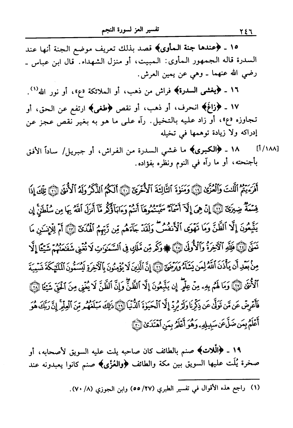 19 - {الَّلاتَ} صنم بالطائف كان صاحبه يلت عليه السويق لأصحابه، أو صخرة يُلَت عليها السويق بين مكة والطائف {وَالْعُزَّى} صنم كانوا يعبدونه عند