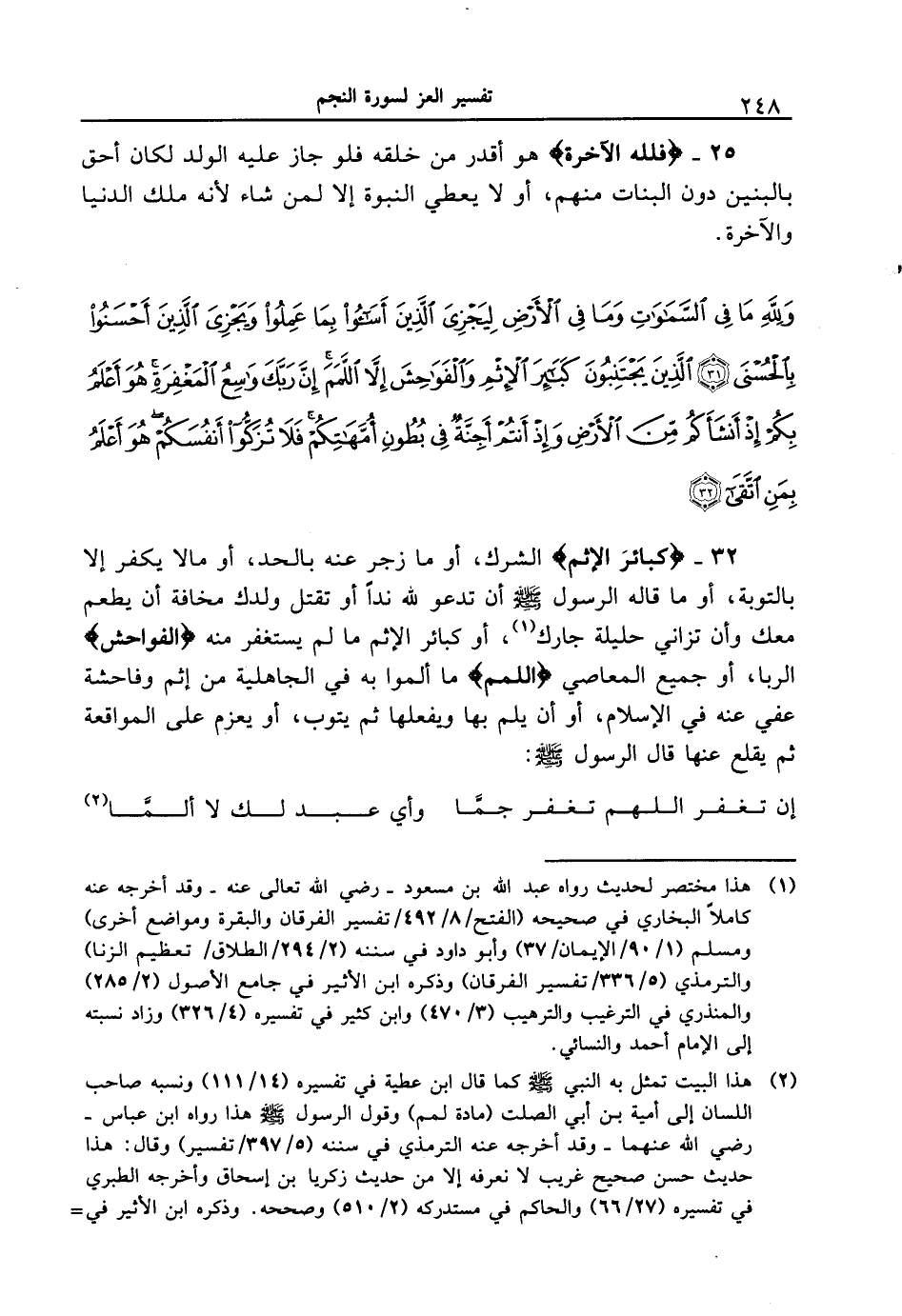 32 - {كَبَآئِرَ الإِثْمِ} الشرك، أو ما زجر عنه بالحد، أو مالا يكفر إلا بالتوبة، أو ما قاله الرسول [صلى الله عليه وسلم] أن تدعو لله نداً أو تقتل ولدك مخافة أن يطعم معك وأن تزاني حليلة جارك، أو كبائر الإثم ما لم يستغفر منه {الفواحش} الربا، أو جميع المعاصي {اللَّمَمَ} ما ألموا به من الجاهلية من إثم وفاحشة عفي عنه في الإسلام، أو أن يلم بها ويفعلها ثم يتوب، أو يعزم على المواقعة ثم يقلع عنها قال الرسول [صلى الله عليه وسلم] :