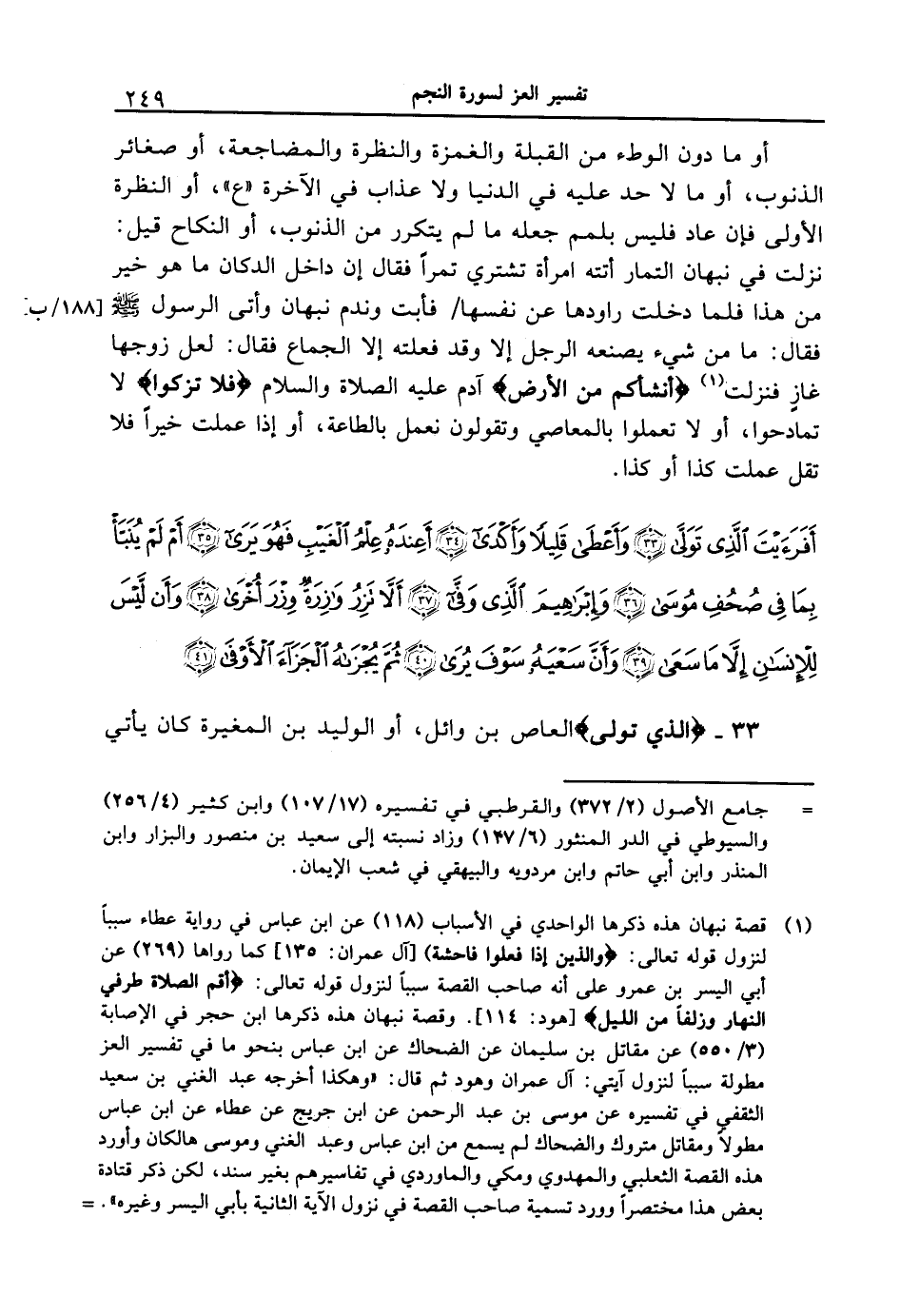 {أفرأيت الذي تولى (33) وأعطى قليلاً وأكدى (34) أعنده علم الغيب فهو يرى (35) أم لم ينبأ بما في صحف موسى (36) وإبراهيم الذي وفى (37) ألا تزر وازرة وزر أخرى (38) وأن ليس للإنسان إلا ما سعى (39) وأن سعيه سوف يُرى (40) ثم يجزاه الجزاء الأوفى (41) }