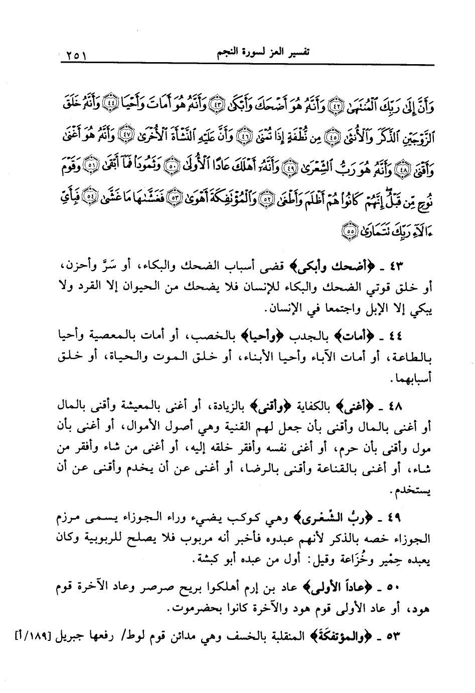 43 - {أَضْحَكَ وَأَبْكَى} قضى أسباب الضحك والبكاء، أو سَرَّ وأحزن، أو خلق قوتي الضحك والبكاء للإنسان فلا يضحك من الحيوان إلا القرد ولا يبكي إلا الإبل واجتمعا في الإنسان.