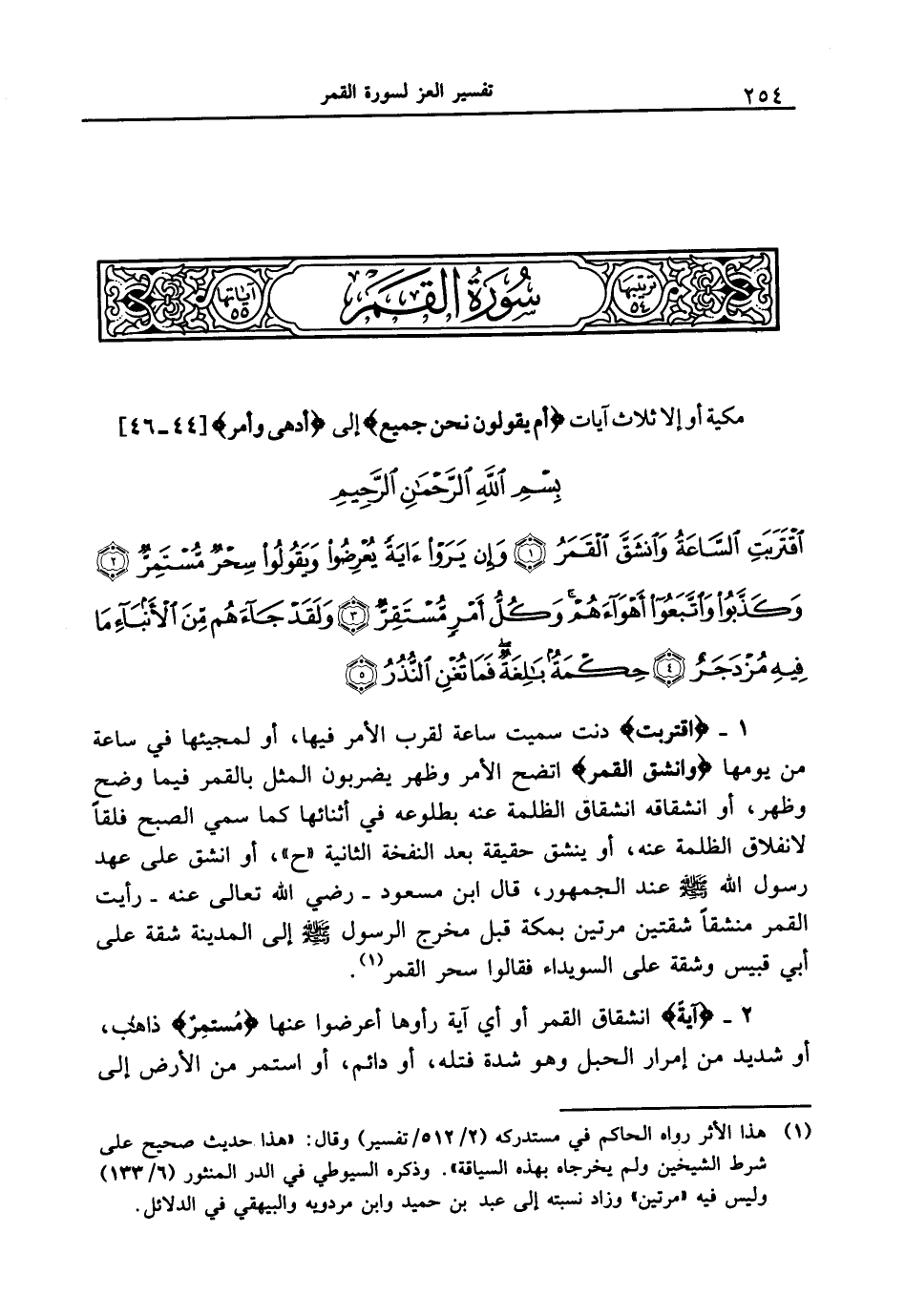1 - {اقْتَرَبَتِ} دنت سميت ساعة لقرب الأمر فيها، أو لمجيئها في ساعة من يومها {وَانشَقَّ الْقَمَرُ} اتضح الأمر وظهر يضربون المثل بالقمر فيما وضح وظهر، أو انشقاقه انشقاق الظلمة عنه بطلوعه في أثنائها كما سمي الصبح فلقاً لانفلاق الظلمة عنه، أو ينشق حقيقة بعد النفخة الثانية " ح "، أو انشق على عهد رسول الله [صلى الله عليه وسلم] عند الجمهور، قال ابن مسعود - رضي الله تعالى عنه - رأيت القمر منشقاً شقتين مرتين بمكة قبل مخرج الرسول [صلى الله عليه وسلم] إلى المدينة شقة على أبي قبيس وشقة على السويداء فقالوا سحر القمر.