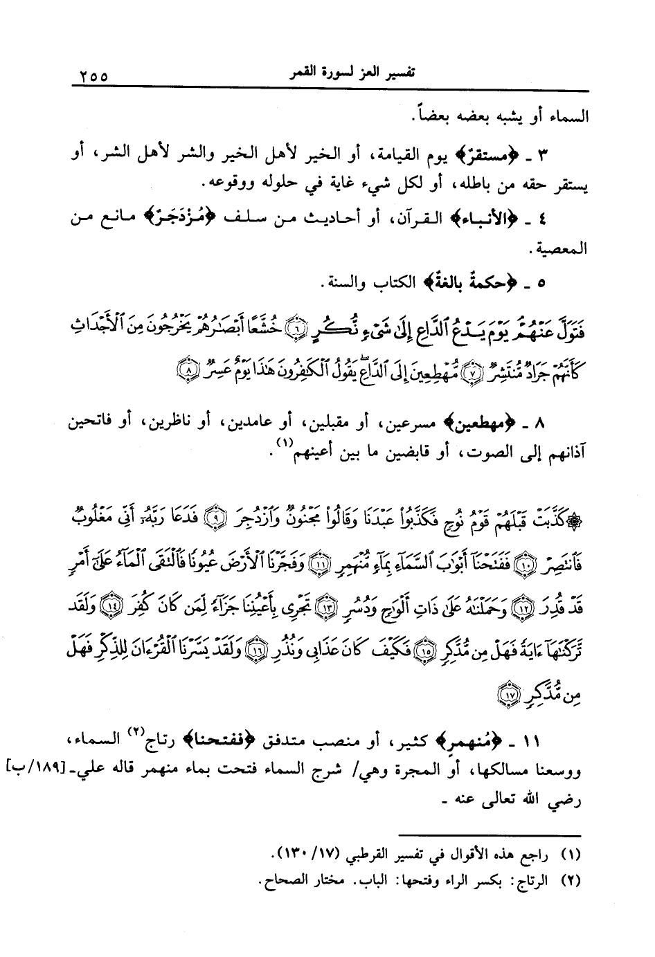 11 - {مُّنْهَمِرٍ} كثير، أو منصب متدفق {فَفَتَحْنَآ} رتاج السماء، ووسعنا مسالكها، أو المجرة وهي [189 / ب] : شرج السماء فتحت بماء منهمر قاله علي - رضي الله تعالى عنه -.