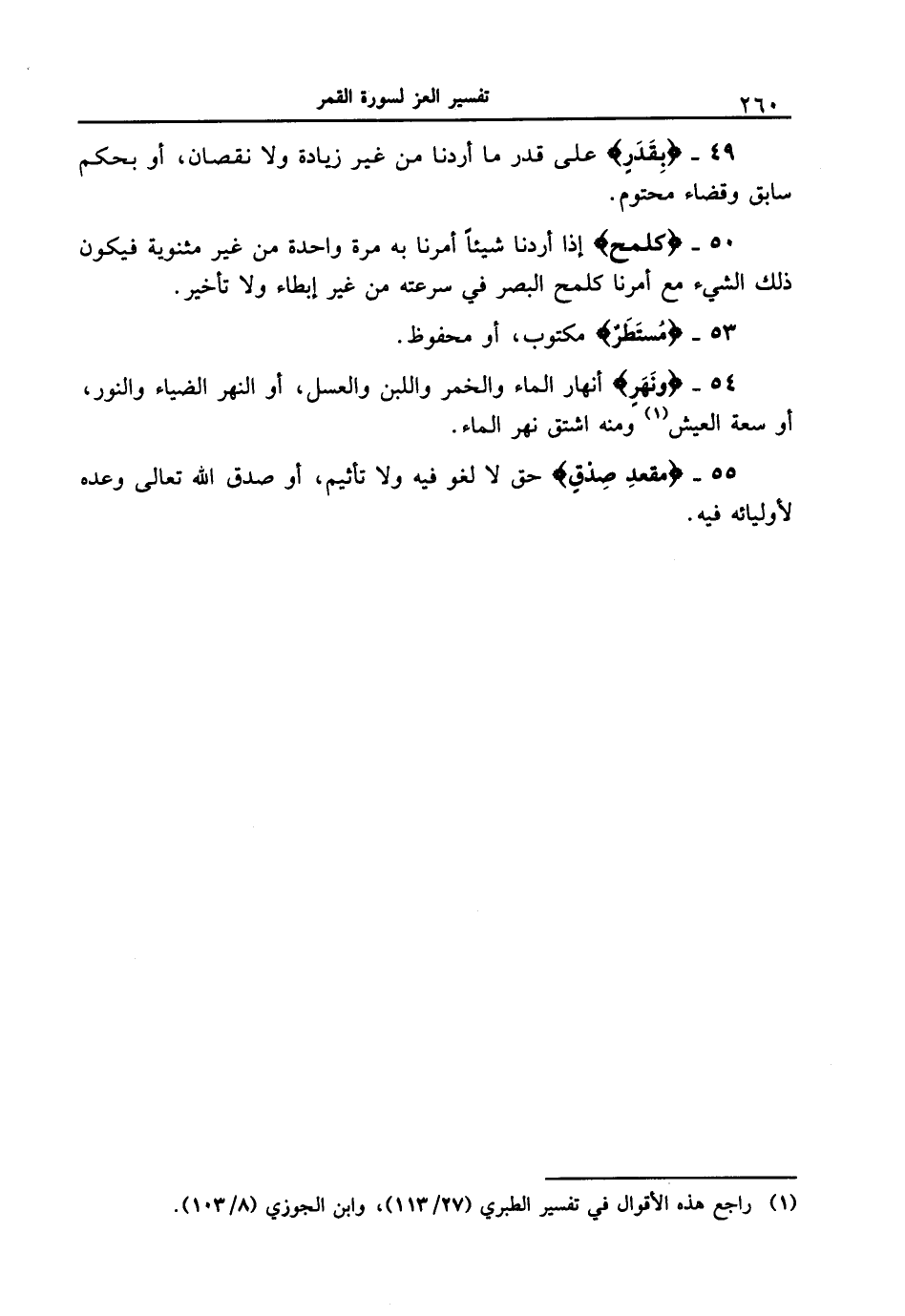 49 - {بِقَدَرٍ} على قدر ما أردنا من غير زيادة ولا نقصان، أو بحكم سابق وقضاء محتوم.