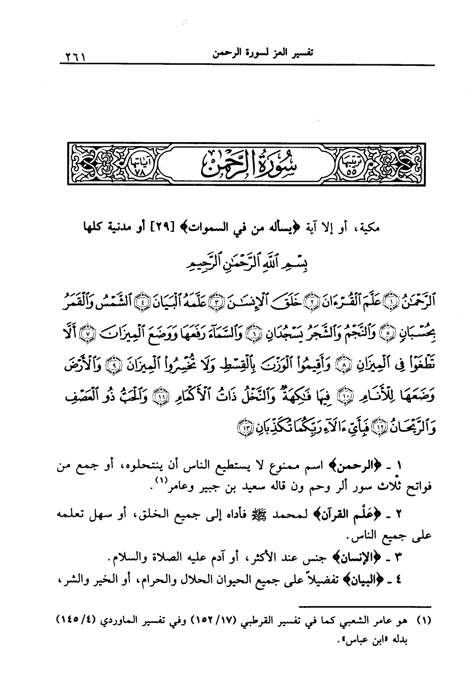 1 - {الرَّحْمَنُ} اسم ممنوع لا يستطيع الناس أن ينتحلوه، أو جمع من فواتح ثلاث سور ألر وحم ون قاله سعيد بن جبير وعامر.