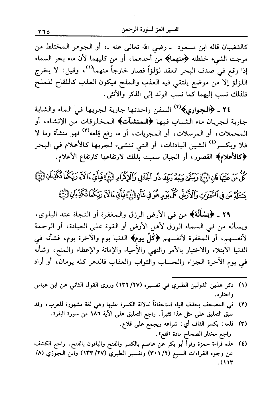 24 - {الجواري} السفن واحدتها جارية لجريها في الماء والشابة جارية لجريان ماء الشباب فيها {المنشآت} المخلوقات من الإنشاء، أو المحملات، أو المرسلات، أو المجريات، أو ما رفع قِلعه فهو منشأة وما لا فلا وبكسر الشين البادئات، أو التي تنشئ لجريها كالأعلام في البحر {كالأعلام} القصور، أو الجبال سميت بذلك لارتفاعها كارتفاع الأعلام.