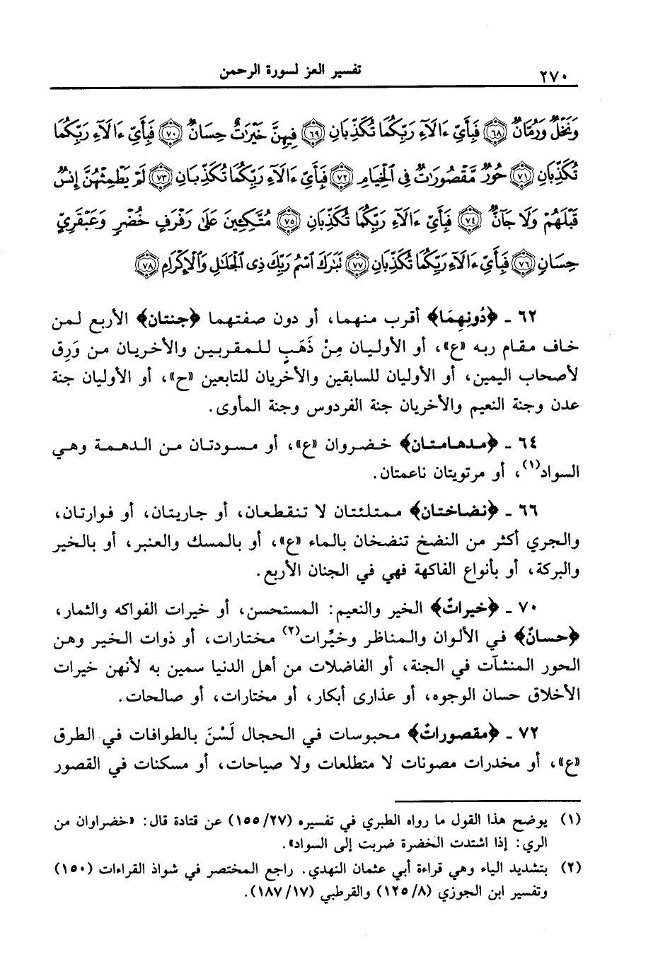 66 - {نَضَّاخَتَانِ} ممتلئتان لا تنقطعان، أو جاريتان، أو فوارتان، والجري أكثر من النضخ تنضخان بالماء " ع "، أو بالمسك والعنبر، أو بالخير والبركة، أو بأنواع الفاكهة فهي في الجنان الأربع.