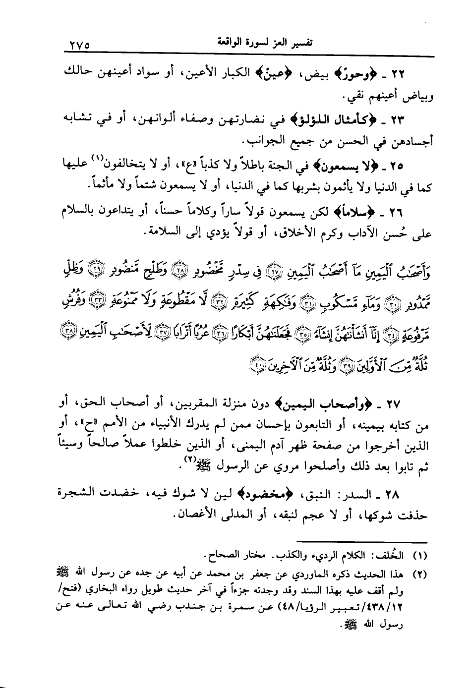 28 - السدر: النبق، {مَّخْضُودٍ} لين لا شوك فيه، خضدت الشجرة حذفت شوكها، أو لا عجم لنبقه، أو المدلى الأغصان.