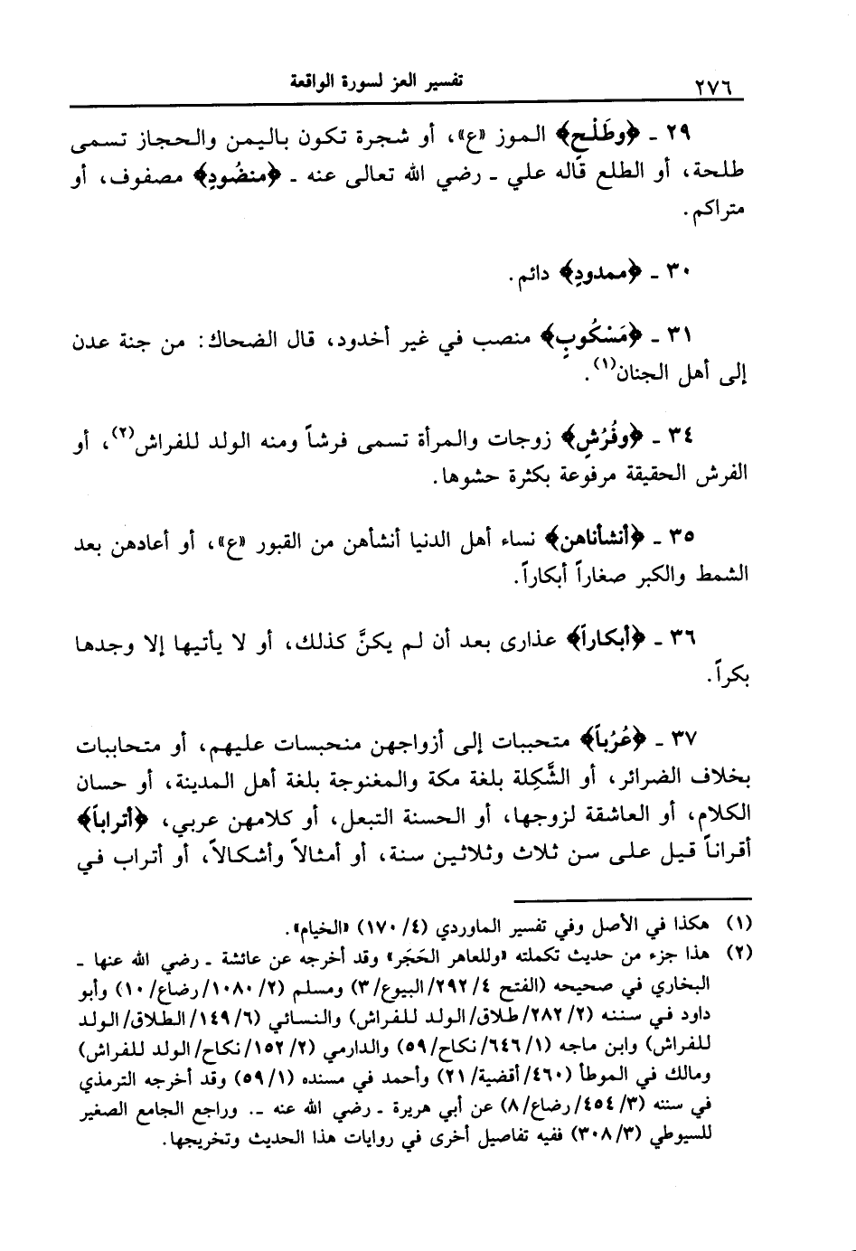 37 - {عُرُباً} متحببات إلى أزواجهن منحبسات عليهم، أو متحاببات بخلاف الضرائر، أو الشَّكِلة بلغة مكة والمغنوجة بلغة أهل المدنية، أو حسان الكلام، أو العاشقة لزوجها، أو الحسنة التبعل، أو كلامهن عربي، {أَتْرَاباً} أقراناً قيل على سن ثلاث وثلاثين سنة، أو أمثالاً وأشكالاً، أو أتراب في