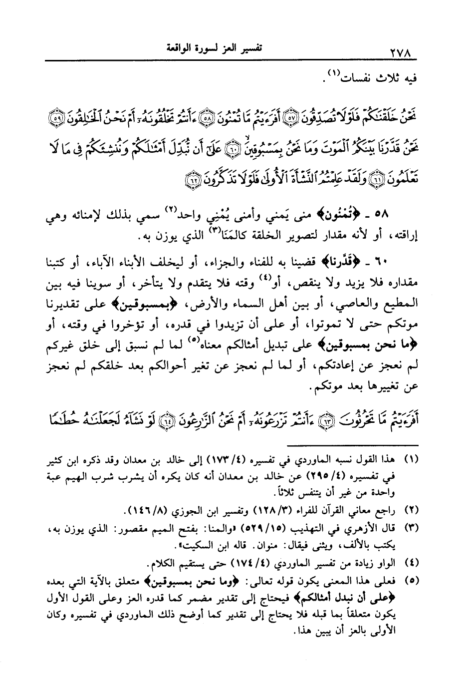 60 - {قَدَّرْنَا} قضينا به للفناء والجزاء، أو ليخلف الأبناء الآباء، أو كتبنا مقداره فلا يزيد ولا ينقص، أو وقته فلا يتقدم ولا يتأخر، أو سوينا فيه بين المطيع والعاصي، أو بين أهل السماء والأرض، {بِمَسْبُوقِينَ} على تقديرنا موتكم حتى لا تموتوا، أو على أن تزيدوا في قدره، أو تؤخروا في وقته، أو {ما نَحْنُ بِمَسْبُوقِينَ} على تبديل أمثالكم معناه لما لم نسبق إلى خلق غيركم لم نعجز نحن إعادتكم، أو لما لم نعجز عن تغير أحوالكم بعد خلقكم لم نعجز عن تغييرها بعد موتكم.