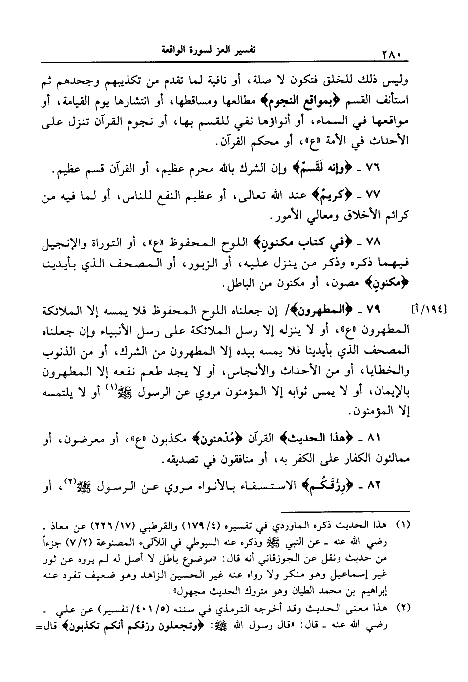 78 - {فِى كِتَابٍ مَّكْنُونٍ} اللوح المحفوظ " ع "، أو التوراة والإنجيل فيهما ذكره وذكر من ينزل عليه، أو الزبور، أو المصحف الذي بأيدينا {مَّكْنُونٍ} مصون، أو مكنون من الباطل.