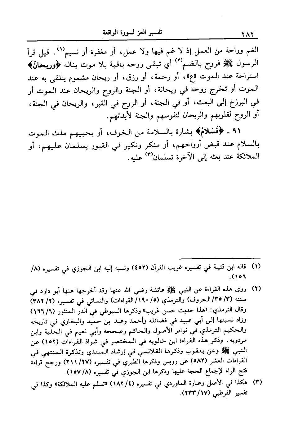 الغم وراحة من عمل إذ لا غم فيها ولا عمل، أو مغفرة أو نسيم. قيل قرأ الرسول [صلى الله عليه وسلم] فروح بالضم أي تبقى روحه باقية بلا موت يناله {وَرَيْحَانٌ} استراحة عند الموت " ع "، أو رحمة، أو رزق، أو ريحان مشموم يتلقى به عند الموت أو تخرج روحه في ريحانه، أو الجنة والروح والريحان عند الموت أو في البرزخ إلى البعث، أو في الجنة، أو الروح في القبر، والريحان في الجنة، أو الروح لقلوبهم والريحان لنفوسهم والجنة لأبدانهم.