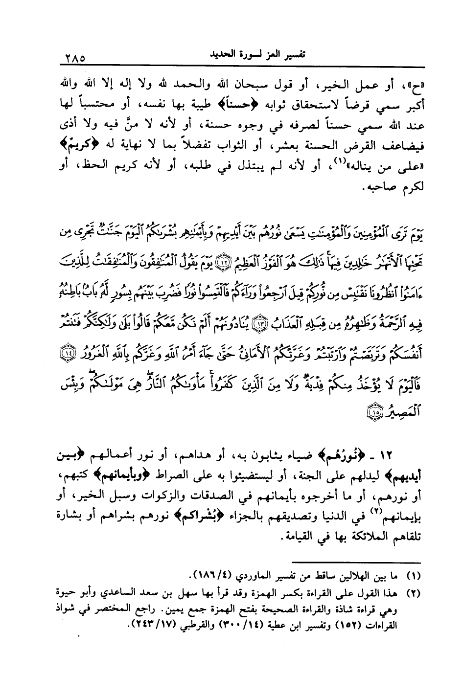 12 - {نُورُهُم} ضياء يثابون به، أو هداهم، أو نور أعمالهم {بَيْنَ أَيْدِيهِمْ} ليدلهم على الجنة، أو ليستضيئوا به على الصراط {وَبِأَيْمَانِهِم} كتبهم، أو نورهم، أو ما أخرجوه بأيمانهم في الصدقات والزكوات وسبل الخير، أو بإيمانهم في الدنيا وتصديقهم بالجزاء {بُشْرَاكُمُ} نورهم بشراهم أو بشارة تلقاهم الملائكة بها في القيامة.