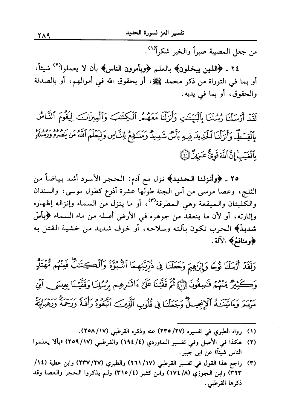 25 - {وَأَنزَلْنَا الْحَدِيدَ} نزل مع آدم: الحجر الأسود أشد بياضاً من الثلج، وعصا موسى من آس الجنة طولها عشرة أذرع كطول موسى، والسندان والكلبتان والميقعة وهي المطرقة، أو ما ينزل من السماء وإنزاله إظهاره وإثارته، أو لأن ما ينعقد من جوهره في الأرض أصله من ماء السماء {بَأْسٌ شَدِيدٌ} الحرب تكون بآلته وسلاحه، أو خوف شديد من خشية القتل به {ومنافع} الآلة.