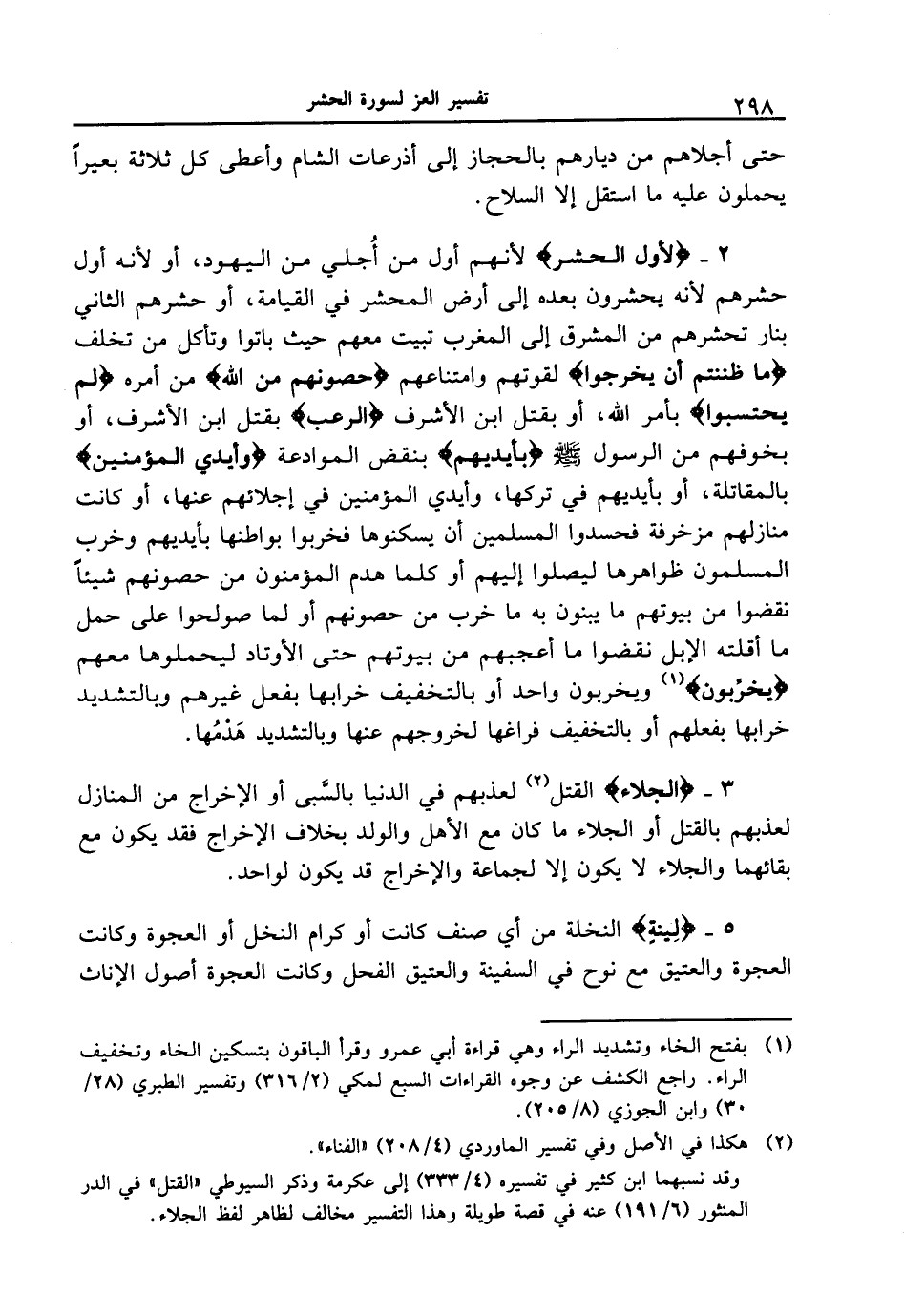 2 - {لأَوَّلِ الْحَشْرِ} لأنهم أول من أُجلي من اليهود، أو لأنه أول حشرهم لأنه يحشرون بعده إلى أرض المحشر في القيامة، أو حشرهم الثاني بنار تحشرهم من المشرق إلى المغرب تبيت معهم حيث باتوا وتأكل من تخلف {مَا ظَنَنتُمْ أَن يَخْرُجُواْ} لقوتهم وامتناعهم {حُصُونُهُم مِّنَ اللَّهِ} من أمره {لَمْ يَحْتَسِبُواْ} بأمر الله، أو بقتل ابن الأشرف {الرُّعْبَ} بقتل ابن الأشرف، أو بخوفهم من الرسول [صلى الله عليه وسلم] {بِأَيْدِيهِمْ} بنقض الموادعة {وَأيْدِى الْمؤْمِنِينَ} بالمقاتلة، أو بأيديهم في تركها، وأيدي المؤمنين في إجلائهم عنها، أو كانت منازلهم مزخرفة فحسدوا المسلمين أن يسكنوها فخربوا بواطنها بأيديهم وخرب المسلمون ظواهرها ليصلوا إليهم أو كلما هدم المؤمنون من حصونهم شيئاً نقضوا من بيوتهم ما يبنون به ما خرب من حصونهم أو لما صولحوا على حمل ما أقلته الإبل نقضوا ما أعجبهم من بيوتهم حتى الأوتاد ليحملوها معهم {يخرِّبون} ويخربون واحد أو بالتخفيف خرابها بفعل غيرهم وبالتشديد خراباً بفعلهم أو بالتخفيف فراغها لخروجهم عنها وبالتشديد هَدْمُها.