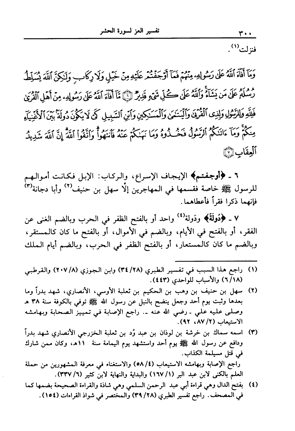 {وما أفاءَ اللهُ علَى رسولِهِ منهمْ فمَآ أوجفتمْ عليهِ منْ خيلٍ ولاَ ركابٍ ولكنَّ اللهَ يسلِّطُ رسلَهُ علَى من يشاءُ واللهُ على كلِّ شيءٍ قديرٌ (6) مَّا أفاءَ اللهُ على رسولهِ منْ أهلِ القرى فللهِ وللرَّسُولِ ولِذِي القربى واليتامى والمساكين وابن السبيل كي لا يكون دولةَ بينَ الأغنياءِ منكمْ ومَا ءاتاكُمُ الرسولُ فخذوهُ وما نهاكمْ عنهُ فانتهواْ واتَّقُواْ اللهَ إنَّ اللهَ شديدُ العِقابِ (7) }