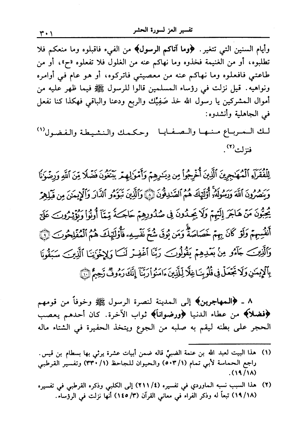 {للفقراءِ المهاجرينَ الذينَ أخرجواْ من ديارهمْ وأموالهمْ يبتغونَ فضلاً من اللهِ ورضواناً وينصرونَ اللهَ ورسولهُ أولئكَ هُمُ الصادقونَ (8) والذينَ تبوءو الدارَ والإيمانَ من قبلهِمْ يحبُّونَ منْ هَاجَرَ إليهمْ ولاَ يجدونَ في صدورهمْ حاجةً ممَّا أوتواْ ويؤثرونَ علَى أنفسهمْ ولوْ كانَ بهمْ خصاصةٌ ومن يوقَ شُحَّ نفسِهِ فأولئكَ هُمُ المفلحونَ (9) والذين جاءوا من بعدهِمْ يقولونَ ربَّنَا اغفرْ لنَا ولإخواننَا الذينَ سبقُونَا بالإيمانِ ولاَ تجعلْ في قلوبِنَا غلاًّ للذينَ ءامنواْ ربَّنا إنَّكَ رءوفٌ رحيمٌ (10) }