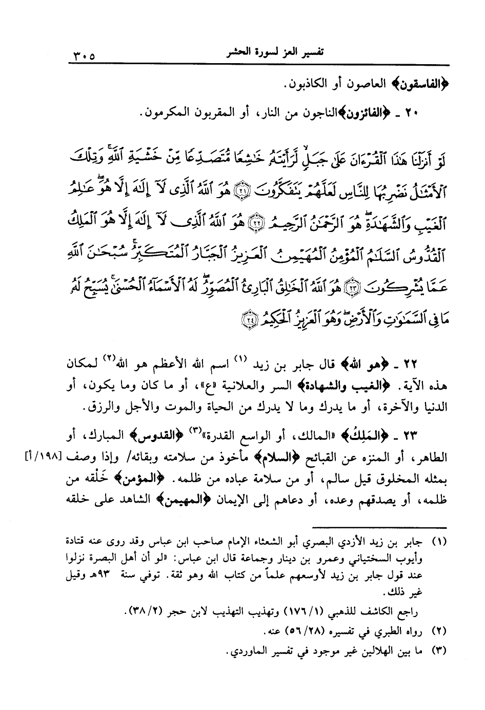 23 - {الْمَلِكُ} " المالك "، أو الواسع القدرة " {الْقُدُّوسُ} المبارك، أو الطاهر، أو المنزه عن القبائح {السَّلامُ} مأخوذ من سلامته وبقائه [198 / أ] / وإذا وصف بمثله المخلوق قيل سالم، أو من سلامة عباده من ظلمه. {الْمُؤْمِنُ} خَلْقه من ظلمه، أو يصدقهم وعده، أو دعاهم إلى الإيمان {الْمُهَيْمِنُ} الشاهد على خلقه