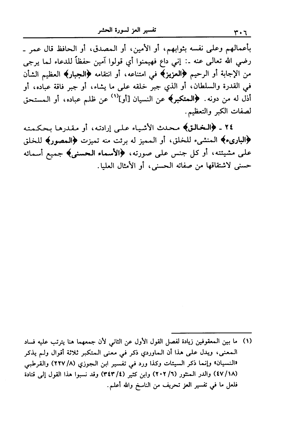 24 - {الْخَالِقُ} محدث الأشياء على إرادته، أو مقدرها بحكمته {البارئ} المنشئ للخلق، أو المميز له برئت منه تميزت {الْمُصَوِّرُ} للخلق على مشيئته، أو كل جنس على صورته، {الأَسْمَآءُ الْحُسْنَى} جميع أسمائه حسنى لاشتقاقها من صفاته الحسنى، أو الأمثال العليا.