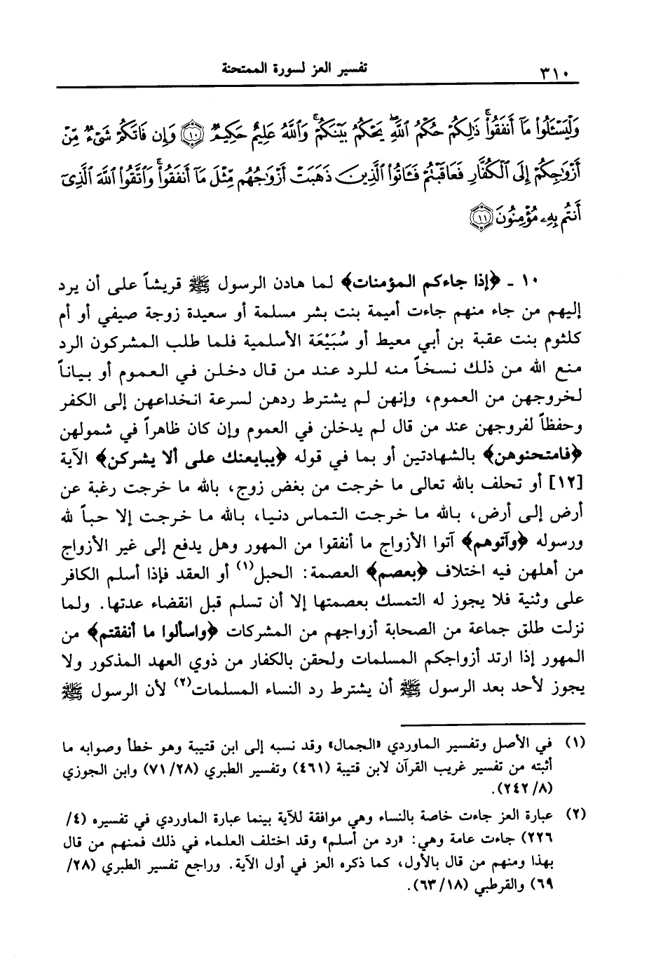 10 - {إذا جاءكم المؤمنات} لما هادن الرسول [صلى الله عليه وسلم] قريشاً على أن يرد إليهم من جاء منهم جاءت أميمة بنت بشر مسلمة أو سعيدة زوجة صيفي أو أم كلثوم بنت عقبة بن أبي معيط أو سُبَيْعَة الأسلمية فلما طلب المشركون الرد منع الله من ذلك نسخاً منه للرد عند من قال دخلن في العموم أو بياناً لخروجهن من العموم، وإنهن لم يشترط ردهن لسرعة انخداعهن إلى الكفر وحفظاً لفروجهن عند من قال لم يدخلن في العموم وإن كان ظاهراً في شمولهن {فَامْتَحِنُوهُنَّ} بالشهادتين أو بما في قوله {يبايعنك على ألا يشركن} الآية [12] أو تحلف بالله تعالى ما خرجت من بغض زوج، بالله ما خرجت رغبة عن أرض إلى أرض، بالله ما خرجت التماس دنيا، بالله ما خرجت إلا حباً لله ورسوله {وآتوهم} آتوا الأزواج ما أنفقوا من المهور وهل يدفع إلى غير الأزواج من أهلهن فيه اختلاف {بِعِصَمِ} العصمة: الحبل أو العقد فإذا أسلم الكافر على وثنية فلا يجوز له التمسك بعصمتها إلا أن تسلم قبل انقضاء عدتها. ولما نزلت طلق جماعة من الصحابة أزواجهم من المشركات {واسألوا مَآ أَنفَقْتُمْ} من المهور إذا ارتد أزواجكم المسلمات ولحقن بالكفار من ذوي العهد المذكور ولا يجوز لأحد بعد الرسول [صلى الله عليه وسلم] أن يشترط رد النساء المسلمات لأن الرسول [صلى الله عليه وسلم]