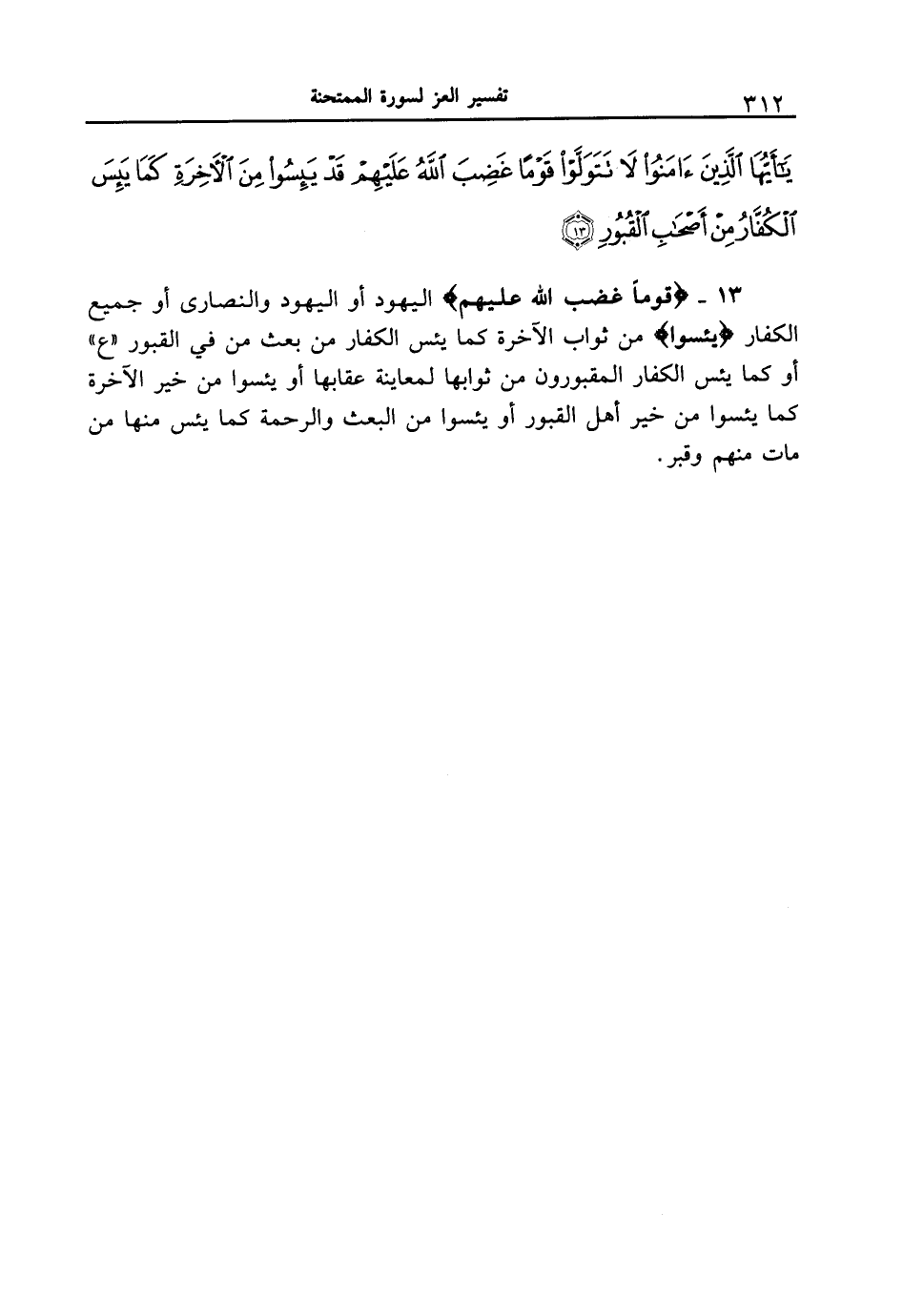 13 - {قَوْماً غَضِبَ اللَّهُ عَلَيْهِمْ} اليهود أو اليهود والنصارى أو جميع الكفار {يَئِسُواْ} من ثواب الآخرة كما يئس الكفار من بعث من في القبور " ع " أو كما يئس الكفار المقبورون من ثوابها لمعاينة عقابها أو يئسوا من خير الآخرة كما يئسوا من خير أهل القبور أو يئسوا من البعث والرحمة كما يئس منها من مات منهم وقبر.