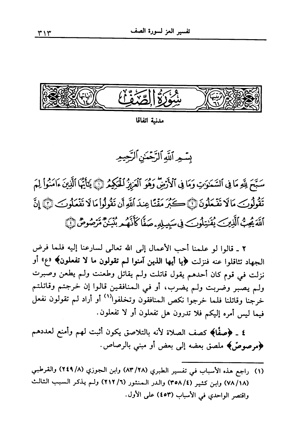 {سبح لله ما في السموات وما في الأرض وهو العزيز الحكيم (1) ياأيها الذين ءامنوا لم تقولون ما لا تفعلون (2) كبر مقتاً عند الله أن تقولوا ما لا تفعلون (3) إنَّ الله يحب الذين يقاتلون في سبيله صفاً كأنهم بنيانٌ مرصوصٌ (4) }