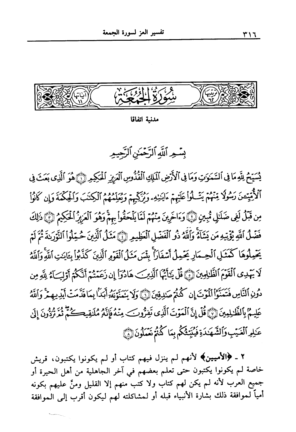 {يسبح لله ما في السموات وما في الأرض الملك القدوس العزيز الحكيم (1) هو الذي بعث في الأميين رسولاً منهم يتلوا عليهم ءاياته ويزكيهم ويعلمهم الكتاب والحكمة وإن كانوا من قبل لفي ضلالٍ مبين (2) وءاخرين منهم لما يلحقوا بهم وهو العزيز الحكيم (3) ذلك فضل الله يؤتيه من يشاء والله ذو الفضل العظيم (4) مثل الذين حملوا التوراة ثم لم يحملوها كمثل الحمار يحمل أسفاراً بئس مثل القوم الذين كذبوا بآيات الله والله لا يهدي القوم الظالمين (5) قل ياأيها الذين هادوا إن زعمتم أنكم أولياء لله من دون الناس فتمنوا الموت إن كنتم صادقين (6) ولا يتمنونه أبداً بما قدمت أيديهم والله عليم بالظالمين (7) قل إن الموت الذي تفرون منه فإنه ملاقيكم ثم تردون إلى عالم الغيب والشهادة فينبئكم بما كنتم تعملون (8) }
