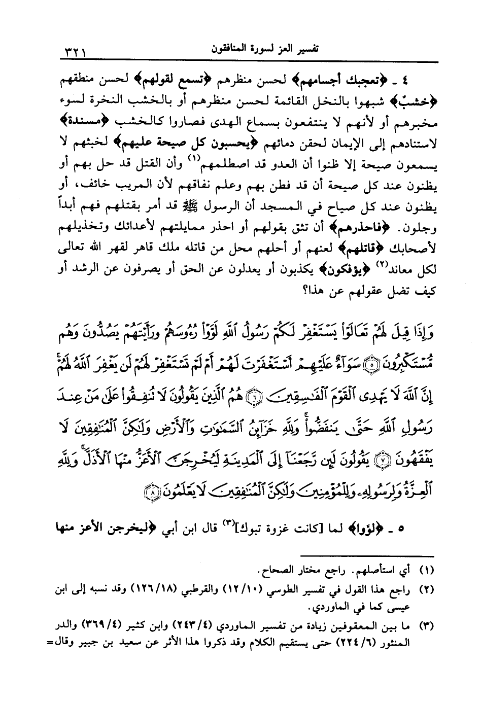 {وإذا قيل لهم تعالوا يستغفر لكم رسولُ الله لووا رءوسهم ورأيتهم يصدون وهم مستكبرون (5) سواءٌ عَلَيْهِمْ أَسْتَغْفَرْتَ لَهُمْ أَمْ لَمْ تَسْتَغْفِرْ لهم لن يغفر الله لهم إن الله لا يهدي القوم الفاسقين (6) هم الذين يقولون لا تنفقوا على من عند رسول الله حتى ينفضوا ولله خزائن السموات والأرض ولكن المنافقين لا يفقهون (7) يقولون لَئِن رَّجَعْنَآ إِلَى الْمَدِينَةِ لَيُخْرِجَنَّ الأَعَزُّ مِنْهَا الأذل ولله العزة ولرسوله وللمؤمنين ولكن المنافقين لا يعلمون (8) }