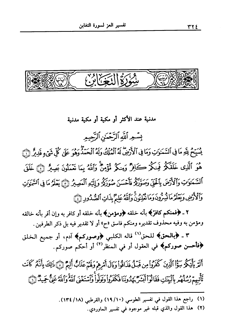 {يسبح لله ما في السموات وما في الأرض له الملك وله الحمد وهو على كل شيء قدير (1) هو الذي خلقكم فمنكم كافر ومنكم مؤمن والله بما تعملون بصير (2) خلق السموات والأرض بالحق وصوركم فأحسن صوركم وإليه المصير (3) يعلمُ ما في السمواتِ والأرضِ ويعلمُ ما تسرونَ وما تُعْلِنُونَ واللهُ عليمٌ بذاتِ الصُّدُورِ (4) }