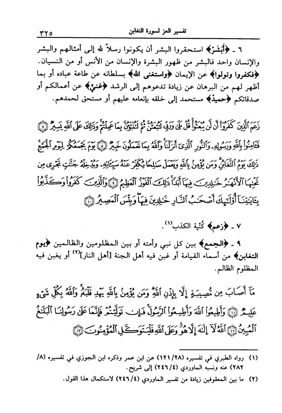 {زَعَمَ الذينَ كفرواْ أن لَّن يُبْعثُواْ قُلْ بلَى وربِّي لتبْعَثُنَّ ثمَّ لتنبَّؤُنَّ بِمَا عملتُمْ وذلكَ على اللهِ يسيرٌ (7) فآمنواْ باللهِ ورسُولِهِ والنُّورِ الذِي أنزلنَا واللهُ بمَا تعملُونَ خَبيرٌ (8) يومَ يجمعُكُمْ ليومِ الجمعْ ذلكَ يَوْمُ التغابنِ وَمَن يُؤْمِن باللهِ ويَعْمَلْ صالحاً يُكَفِّرْ عنْهُ سيِّئاتِهِ ويُدْخِلْهُ جنَّاتٍ تجرِي من تحتِهَا الأنهارُ خالدينَ فيها أبداً ذَلِكَ الفوْزُ العَظِيمُ (9) والذِينَ كفرواْ وكَذَّبُواْ بآياتناْ أولئكَ أصحابُ النَّارِ خالدِينَ فيهَا وبِئْسَ المَصِيرُ (10) }