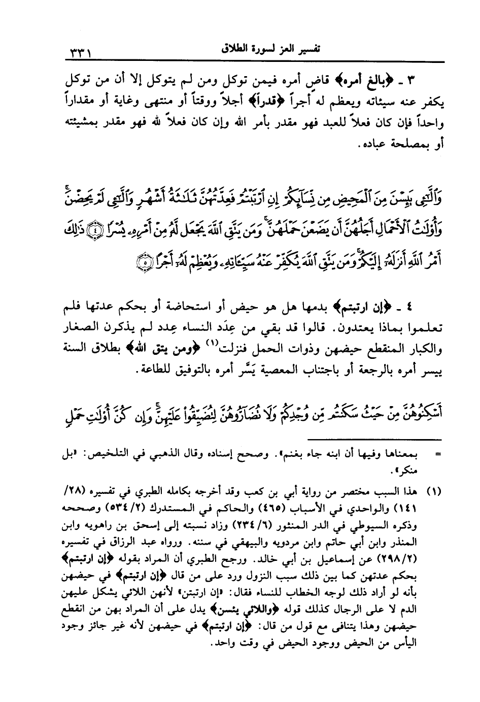 4 - {إِنِ ارْتَبْتُمْ} بدمها هل هو حيض أو استحاضة أو بحكم عدتها فلم تعلموا بماذا يعتدون. قالوا قد بقي من عِدَد النساء عِدد لم يذكرن الصغار والكبار المنقطع حيضهن وذوات الحمل فنزلت {وَمَن يَتَّقِ اللَّهَ} بطلاق السنة ييسر أمره بالرجعة أو باجتناب المعصية يَسَّر أمره بالتوفيق للطاعة.