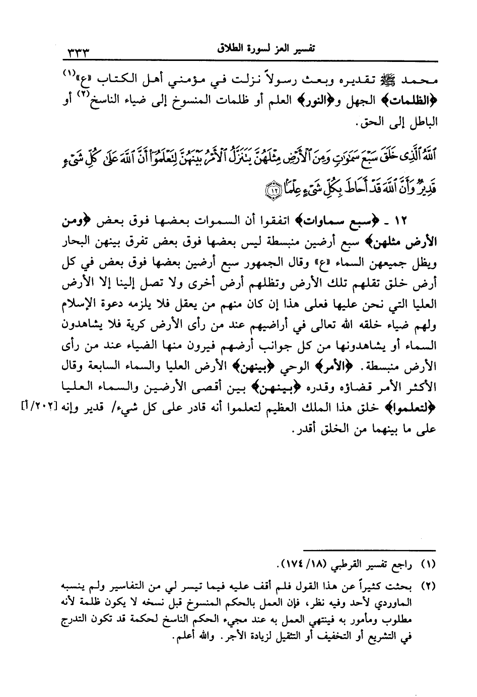 12 - {سَبْعَ سَمَاوَاتٍ} اتفقوا أن السموات بعضها فوق بعض {وَمِنَ الأَرْضِ مِثْلَهُنَّ} سبع أرضين منبسطة ليس بعضها فوق بعض تفرق بينهن البحار ويظل جميعهن السماء " ع " وقال الجمهور سبع أرضين بعضها فوق بعض في كل أرض خلق تقلهم تلك الأرض وتظلهم أرض أخرى ولا تصل إلينا إلا الأرض العليا التي نحن عليها فعلى هذا إن كان منهم من يعقل فلا يلزمه دعوة الإسلام ولهم ضياء خلقه الله تعالى في أراضيهم عند من رأى الأرض كرية فلا يشاهدون السماء أو يشاهدونها من كل جوانب أرضهم فيرون منها الضياء عند من رأى الأرض منبسطة. {الأَمْرُ} الوحي {بَيْنَهُنَّ} الأرض العليا والسماء السابعة وقال الأكثر الأمر قضاؤه وقدره {بَيْنَهُنَّ} بين أقصى الأرضين والسماء العليا {لِتَعْلَمُواْ} خلق هذا الملك العظيم لتعلموا أنه قادر على كل شيء [202 / أ] / قدير وإنه على ما بينهما من الخلق أقدر.