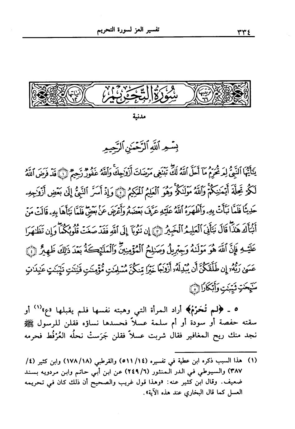 {يا أيها النبي لمَ تحرِّمُ ما أحلَّ اللهُ لَكَ تبتَغِى مرضَاتَ أزواجِكَ واللهُ غفورٌ رحيمٌ (1) قدْ فَرَضَ اللهُ لَكُمْ تَحِلَّةَ أيمانِكُمْ واللهُ مولاكُمْ وهُوَ العليمُ الحكيمُ (2) وإذْ أسرَّ النبيُّ إلى بعضِ أزواجِهِ حديثاً فلمَّا نبَّأتْ به وأظهرهُ اللهُ عليهِ عرَّفَ بعضهُ وأعرضَ عن بعضٍ فلمَّا نبَّأها به قالتْ مَنْ أنبأك هذا قال نبأني العليمُ الخبيرُ (3) إن تتوبا إلى اللهِ فَقَدْ صَغَتْ قُلُوبُكُمَا وإن تظاهرا عليه فإنَّ اللهَ هُوَ مولاهُ وجبريلُ وصالحُ المؤمنينَ والملائكةُ بعدَ ذلكَ ظهيرٌ (4) عَسَى ربُّهُ إن طلقكنُّ أن يبدلهُ أزواجاً خيراً منكنَّ مسلماتٍ مؤمِنَاتٍ قَانِتَاتٍ تَائِبَاتٍ عَبِدَاتٍ سَئِحَاتٍ ثَيِّبَاتٍ وأَبْكَاراً (5) }