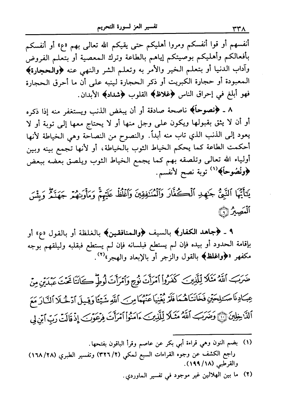 9 - {جَاهِدَ الْكُفَّارَ} بالسيف {وَالْمُنَافِقِينَ} بالغلظة أو بالقول " ع " أو بإقامة الحدود أو بيده فإن لم يستطع فبلسانه فإن لم يستطع فبقلبه وليلقهم بوجه مكفهر {واغلظ} بالقول والزجر أو بالإبعاد والهجر ".