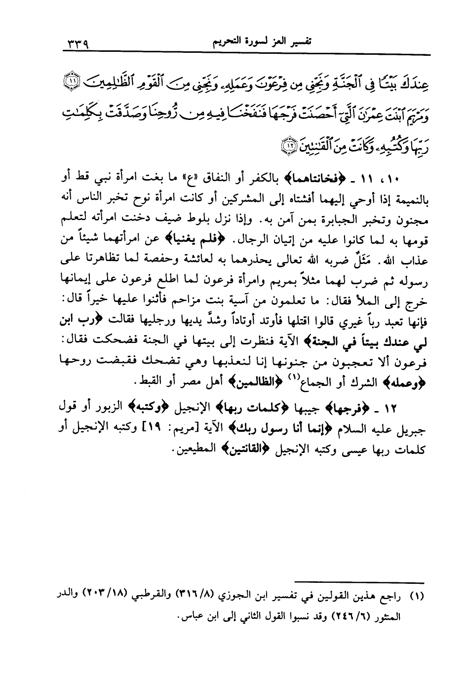 12 - {فرجها} جيبها {كلمات رَبِّهَا) {الإنجيل} (وَكُتُبِهِ} الزبور أو قول جبريل عليه السلام {إِنَّمَآ أَنَاْ رَسُولُ رَبِّكِ} الآية [مريم: 19] وكتبه الإنجيل أو كلمات ربها عيسى وكتبه الإنجيل {القانتين} المطيعين.